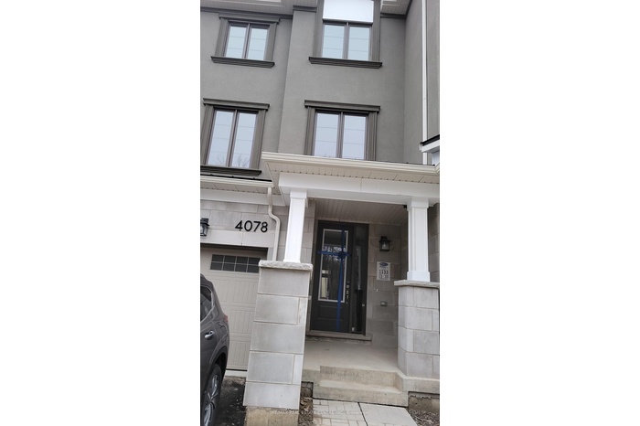Welcome to 4078 Kadic Terrace! Just over one year new new. Mattamy-built freehold townhome backs onto woods with no walkway and features 4 bedrooms, 4 bathrooms, plus a home office/den/kids play room. With 9' ceilings on the main and second levels, hardwood flooring throughout, and no carpet, this upgraded home offers a bedroom with a full ensuite and wet bar on the main level, perfect for guests, in-laws, or a private office. The modern kitchen with extra pantry opens to the dining and great room, which leads to a private deck for morning coffee or evening relaxation. The spacious primary suite boasts a walk-in closet, double sinks, and a luxurious upgraded shower. Additional upgrades include an electric fireplace, bath oasis, super shower, and hot/cold water lines in the garage. A rare opportunity to own a stylish and functional home in a sought-after location!