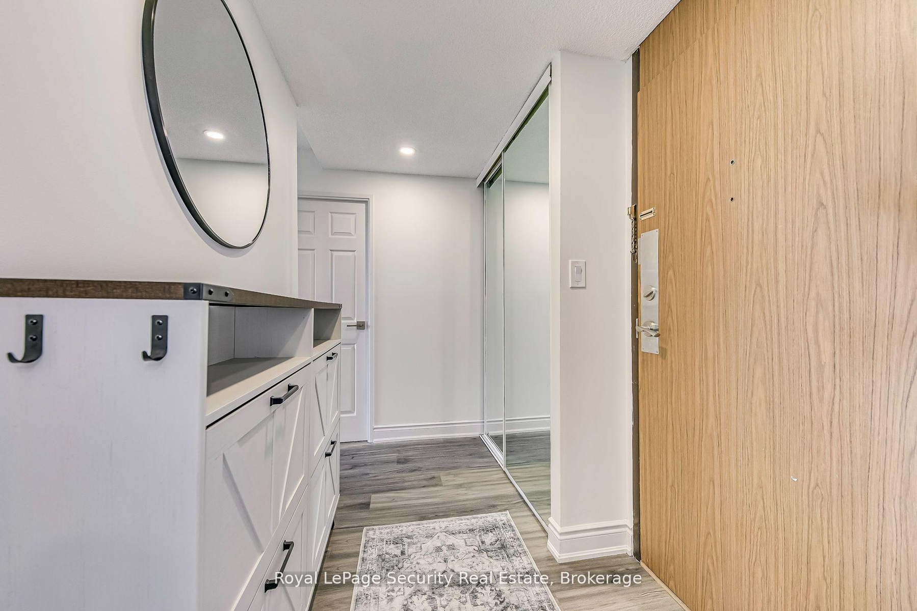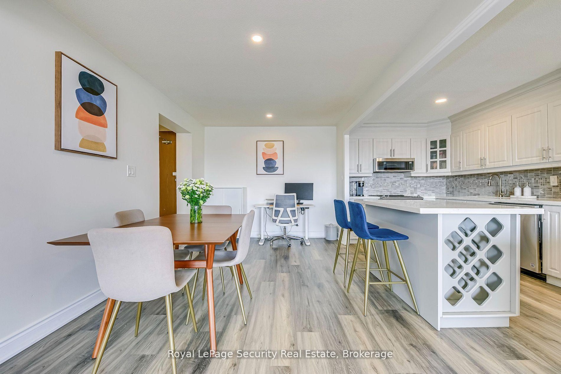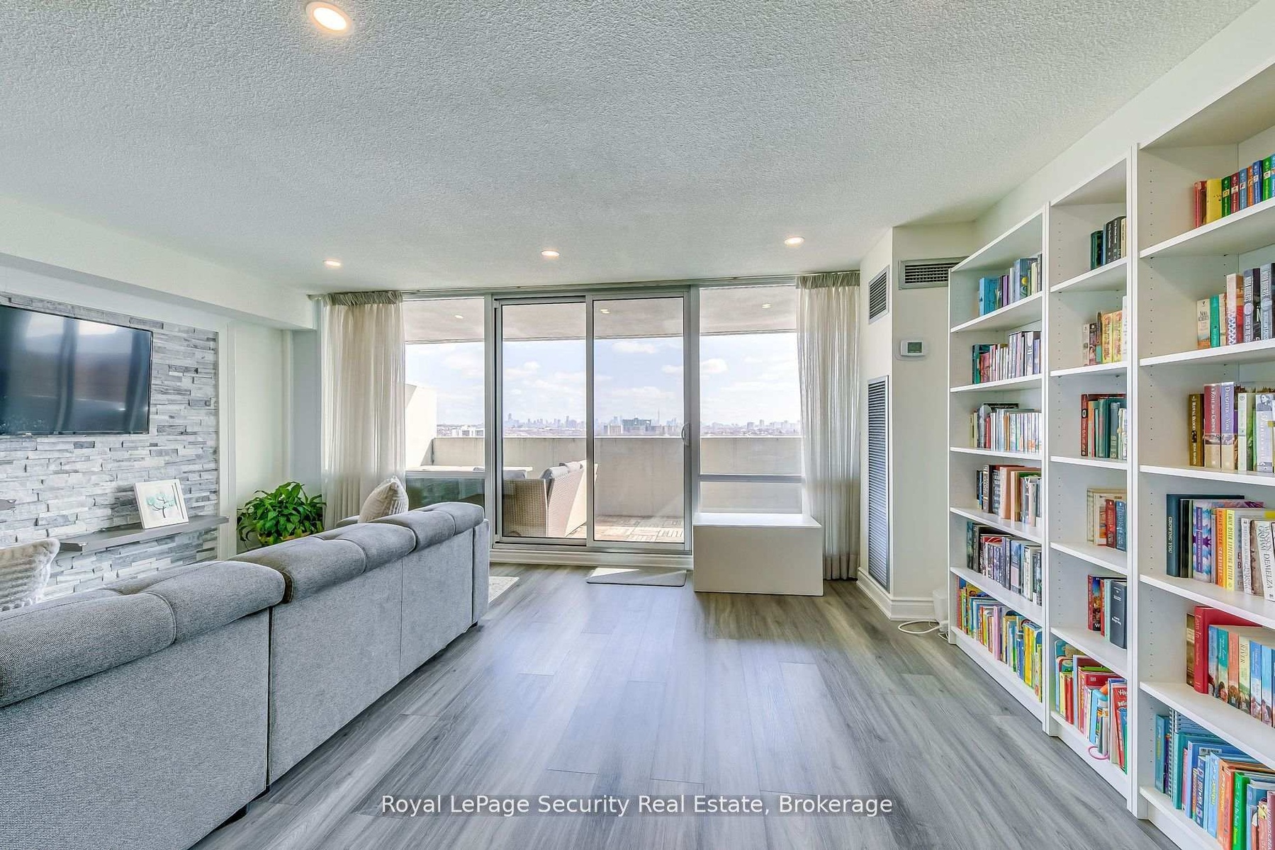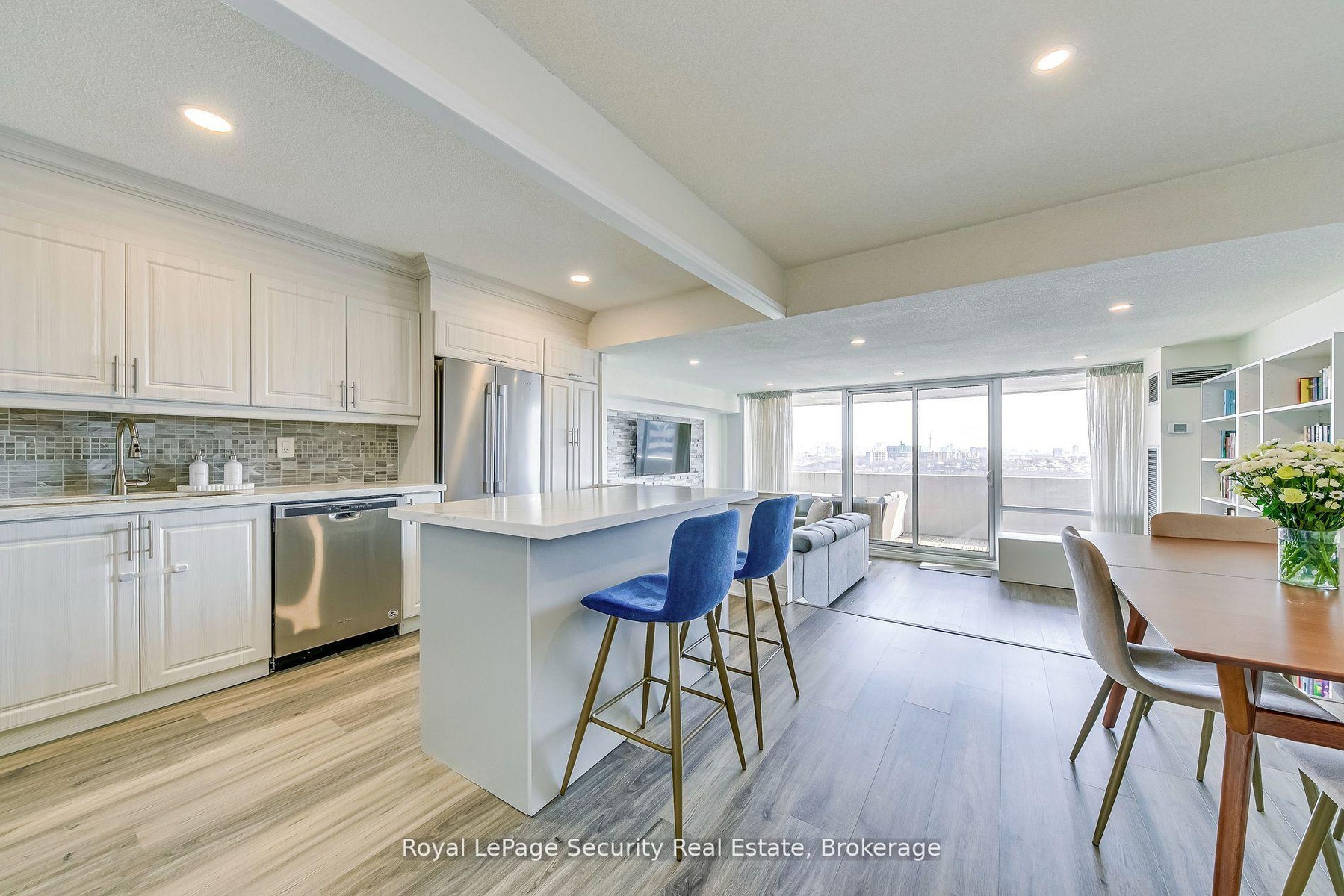 Welcome to the highly sought-after Lambton Square community! This stunning, updated top-floor unit offers a spacious and bright open-concept layout with high-end finishes throughout. 1030sqft living space + 130sqft balcony, total 1160sqft. The modern gourmet kitchen is a chefs dream, featuring ample cupboard space, undermount lighting, a central island with breakfast bar, quartz countertops, stylish backsplash, and stainless steel appliances including a fridge, stove, dishwasher, microwave rangehood. The spacious sunken living room, combined with the dining area, leads to a large balcony (5.55 x 2.23 meters) with panoramic south east city views and the CN Tower. Enjoy outdoor entertaining with an electric barbeque allowed. This lovely home boasts 2 generously sized bedrooms and 2 updated bathrooms, including a primary bedroom with a large mirrored closet and a 4-piece ensuite. The unit also features a laundry room with a new washer, new dryer, and shelving for added convenience. New flooring, baseboard and fresh professional paint were completed in November 2024. Included with the property is 1 parking space & 1 locker. The building has been elegantly renovated, with updated hallways and lobby. Residents enjoy access to excellent amenities such as an outdoor pool, party room, gym, sauna, car wash, bike storage, and nearby walking trails. Steps to TTC, the future LRT, and just a short walk to James Gardens and the trail system. Close to Lambton Golf & Country Club and Scarlett Woods Golf Course. Don't miss your chance to own this gorgeous home in a prime location!