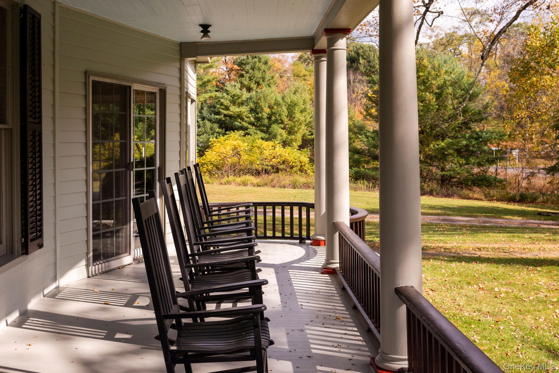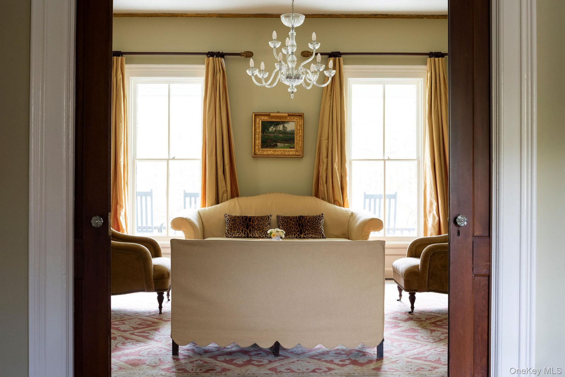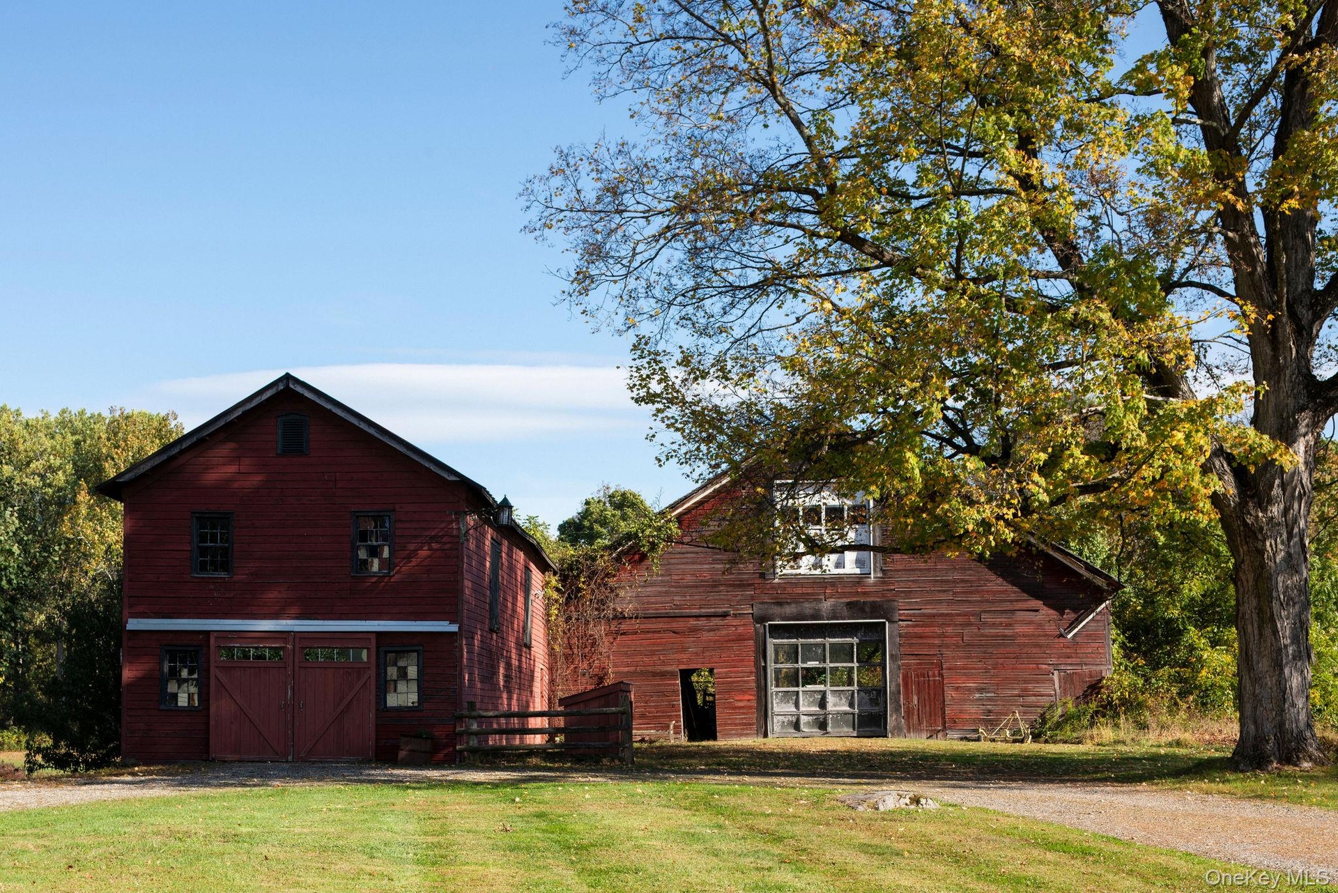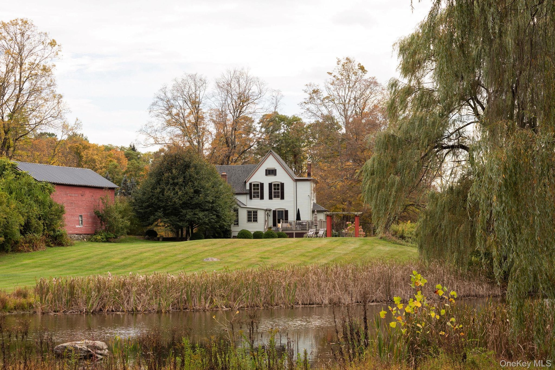 Introducing Knickerbocker Farm, an elegant circa 1790 farmhouse overlooking rolling meadows, a tranquil pond, and two antique barns, on over 12 acres, just three miles from the heart of Rhinebeck. Enter through the classic front hall with its graceful staircase and sense of history. The living, dining, and sitting rooms are graciously proportioned, each featuring 10-foot ceilings, decorative crown and base moldings, marble fireplaces, and beautifully preserved wide-board floors that flow throughout the home. Pocket doors connect the living room and sitting rooms, adding both charm and flexibility. Sunlight pours into the corner sunroom from the east and south, while the eat-in kitchen, anchored by a striking stone fireplace, offers a warm gathering space for casual dining. French doors open to a mahogany back deck, perfect for enjoying the sweeping pastoral views. A first-floor bedroom and full bath allow for guest accommodations or one-level living. Upstairs, four sunlit bedrooms include two spacious rooms, a cozy smaller bedroom, and one tucked away in its own wing, as well as two full baths. A full walk-up attic provides generous storage. The stately front porch spans the home’s facade, inviting quiet moments of relaxation and connection to the landscape. Knickerbocker Farm is both enchanting and timeless - elegantly designed yet comfortably to live in, with thoughtful details and sweet nooks throughout. A true Hudson Valley treasure.