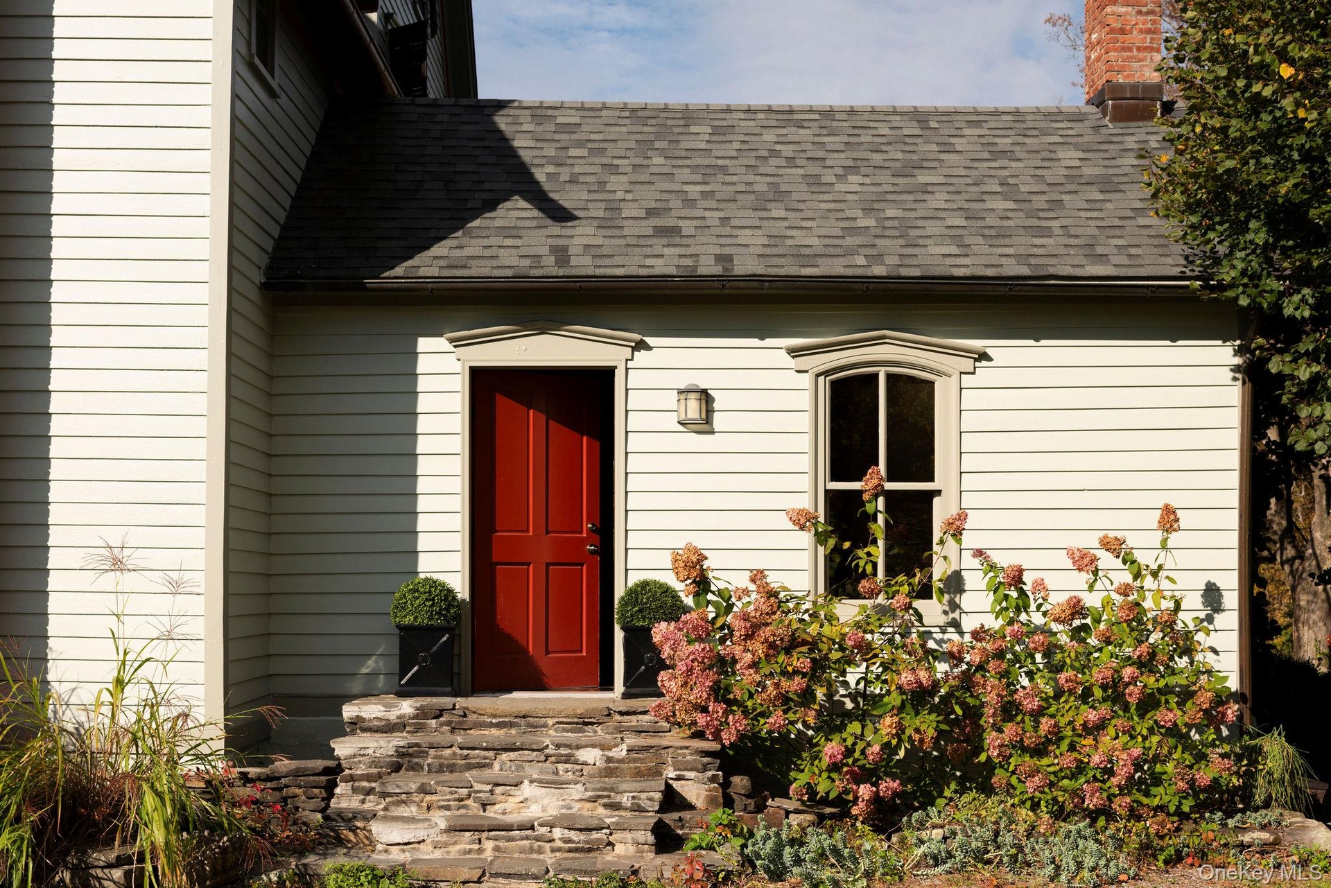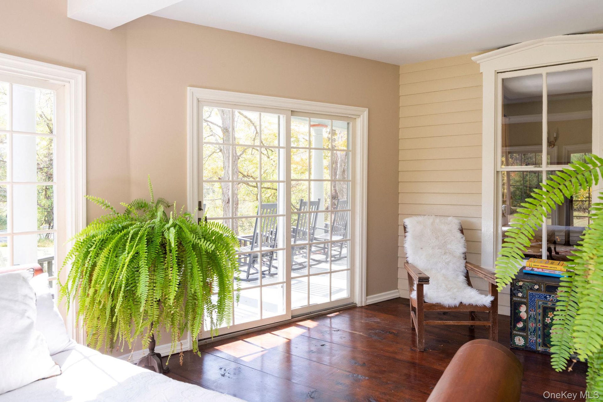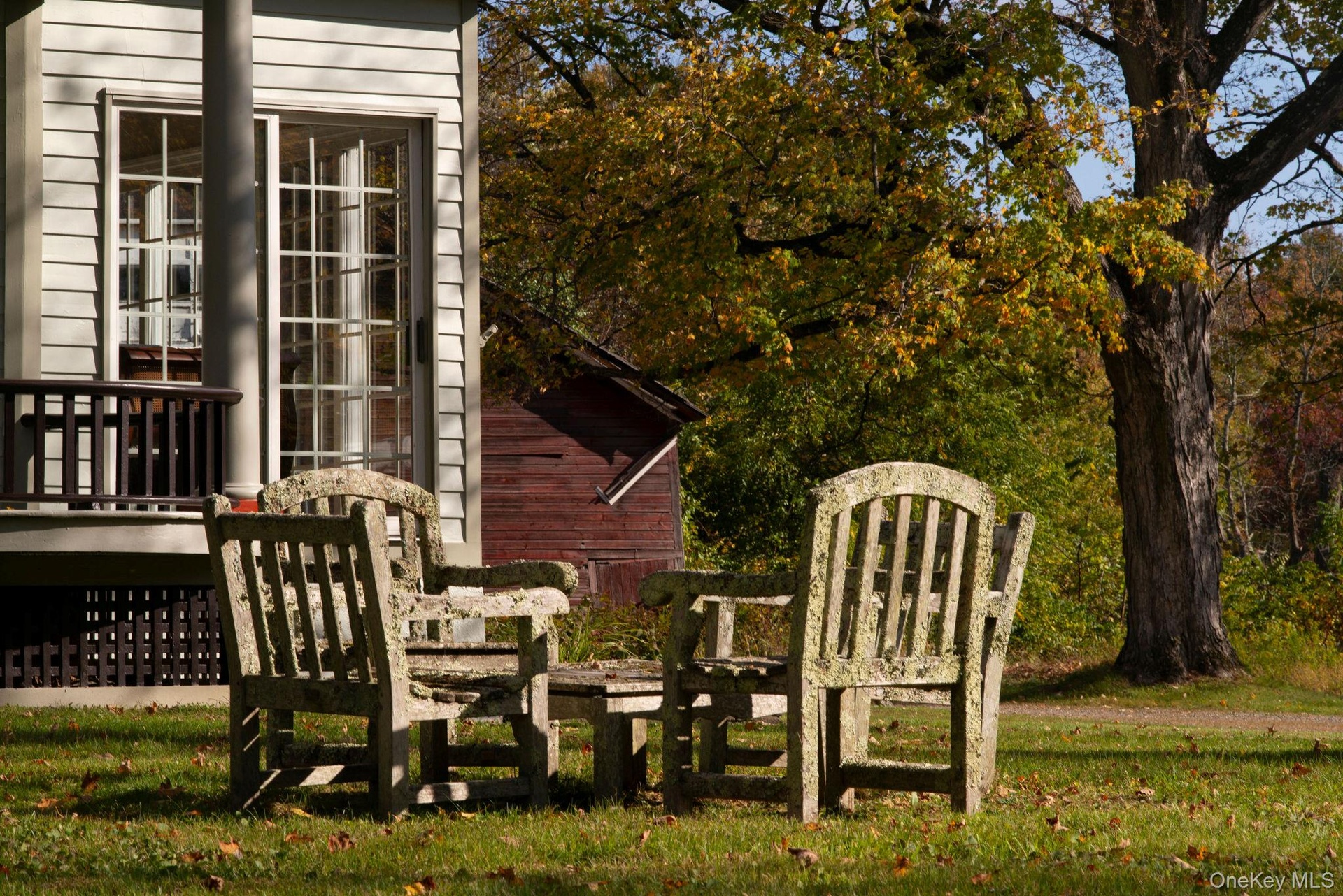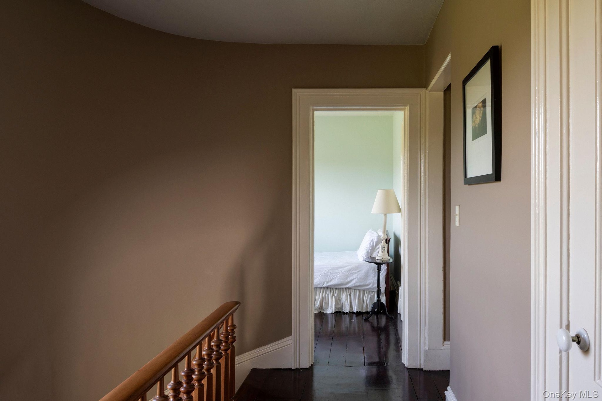 Introducing Knickerbocker Farm, an elegant circa 1790 farmhouse overlooking rolling meadows, a tranquil pond, and two antique barns, on over 12 acres, just three miles from the heart of Rhinebeck. Enter through the classic front hall with its graceful staircase and sense of history. The living, dining, and sitting rooms are graciously proportioned, each featuring 10-foot ceilings, decorative crown and base moldings, marble fireplaces, and beautifully preserved wide-board floors that flow throughout the home. Pocket doors connect the living room and sitting rooms, adding both charm and flexibility. Sunlight pours into the corner sunroom from the east and south, while the eat-in kitchen, anchored by a striking stone fireplace, offers a warm gathering space for casual dining. French doors open to a mahogany back deck, perfect for enjoying the sweeping pastoral views. A first-floor bedroom and full bath allow for guest accommodations or one-level living. Upstairs, four sunlit bedrooms include two spacious rooms, a cozy smaller bedroom, and one tucked away in its own wing, as well as two full baths. A full walk-up attic provides generous storage. The stately front porch spans the home’s facade, inviting quiet moments of relaxation and connection to the landscape. Knickerbocker Farm is both enchanting and timeless - elegantly designed yet comfortably to live in, with thoughtful details and sweet nooks throughout. A true Hudson Valley treasure.