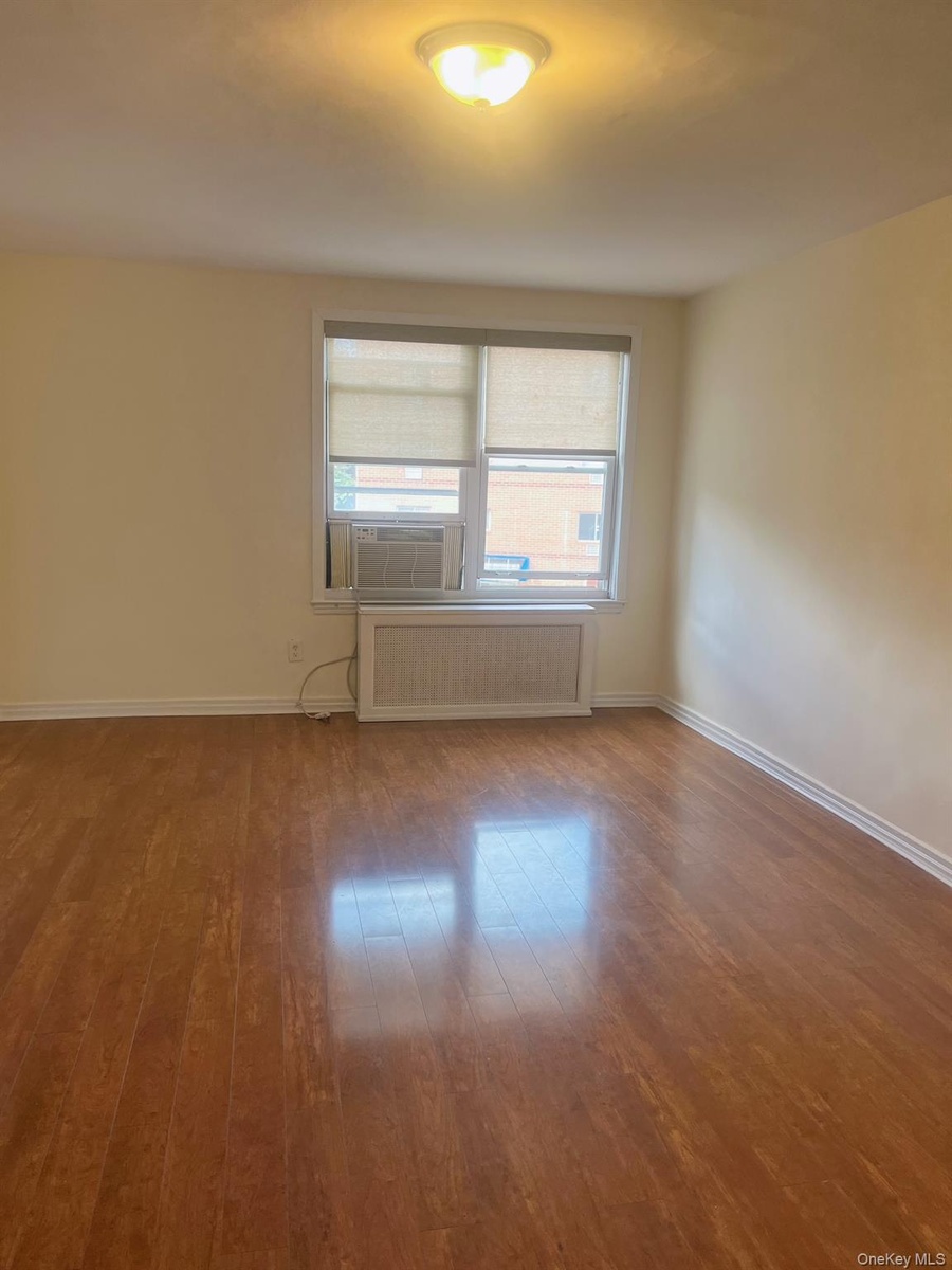 - Unfurnished room featuring wood finished floors, radiator heating unit, and cooling unit