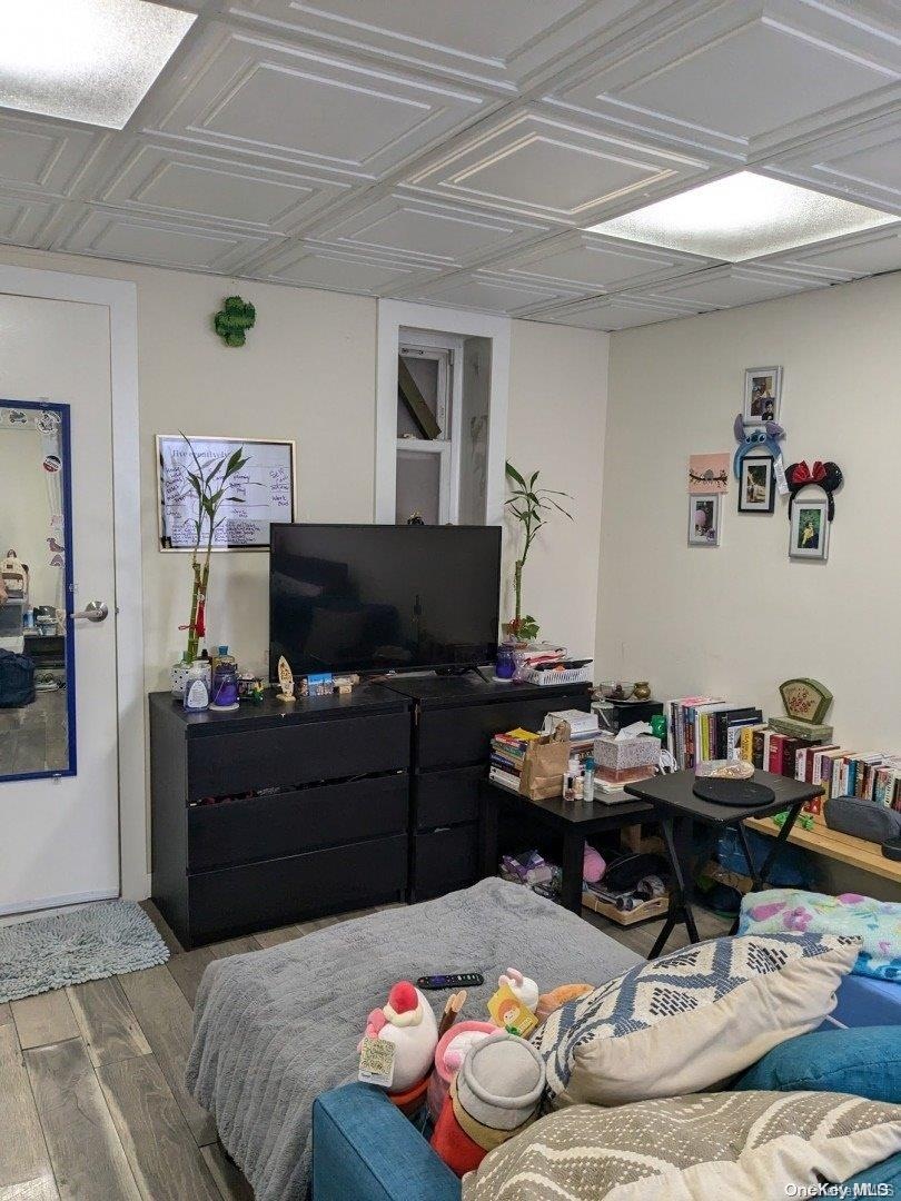 - Bedroom featuring wood finished floors and an ornate ceiling
