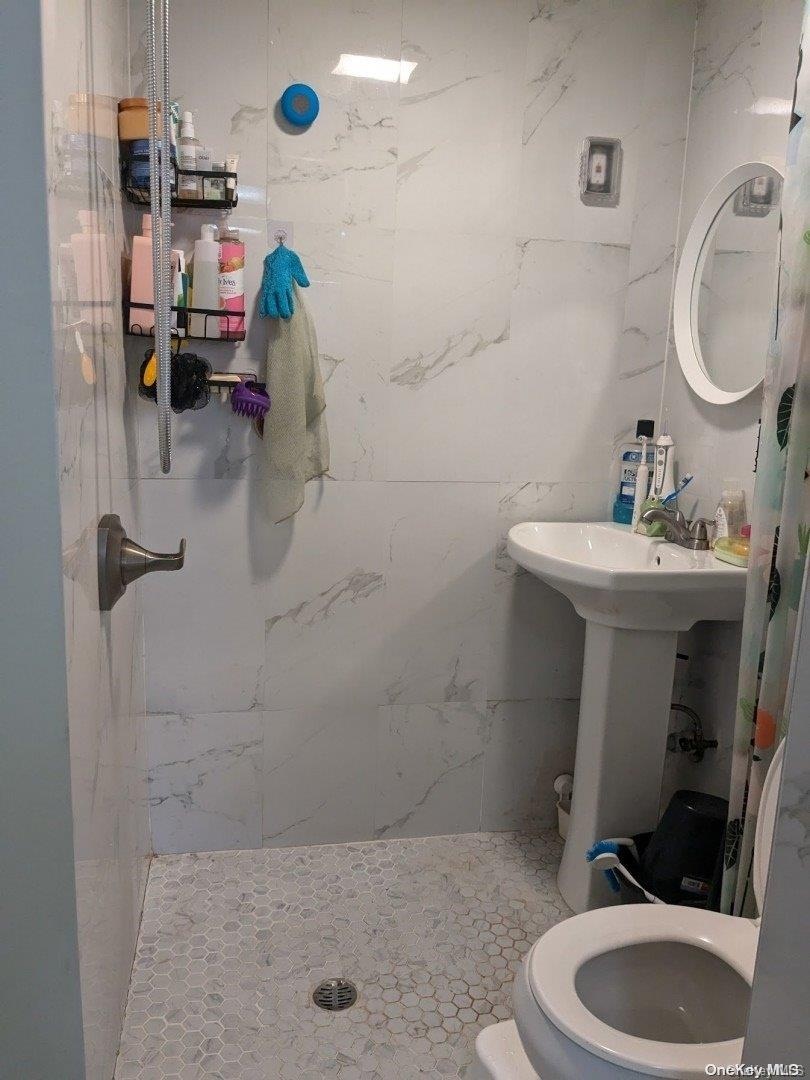 - Bathroom with a marble finish shower and toilet