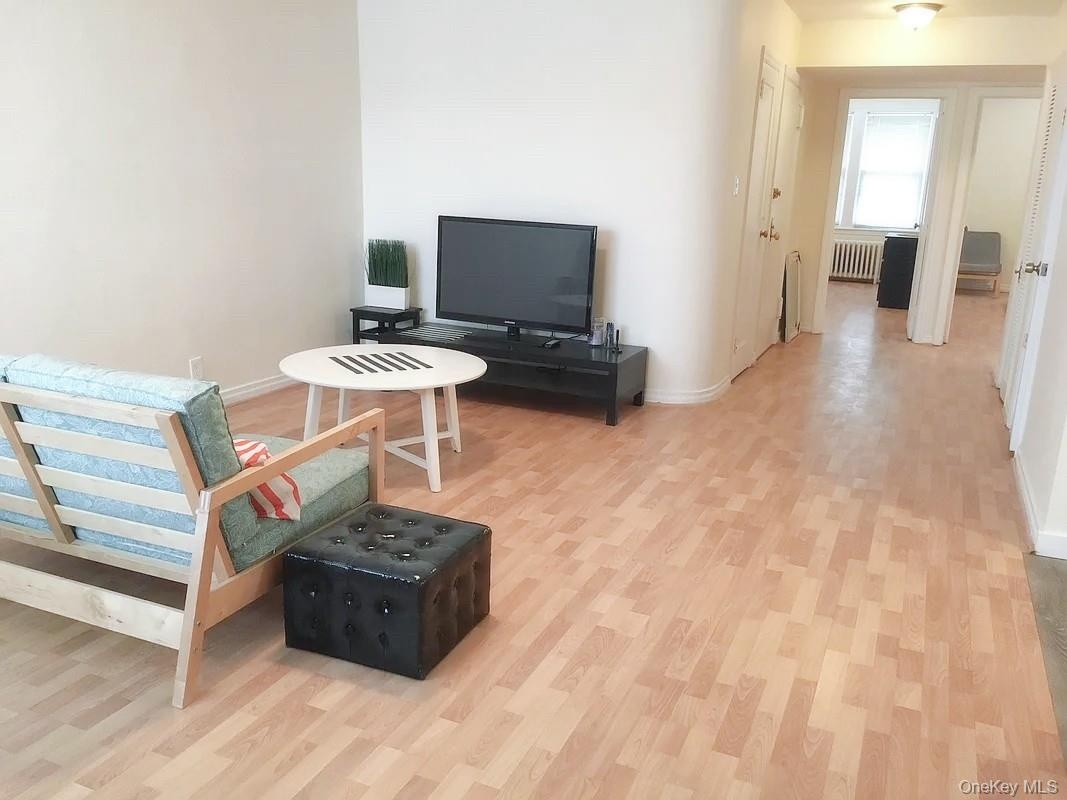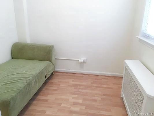 - Living area with light wood-type flooring and radiator heating unit
