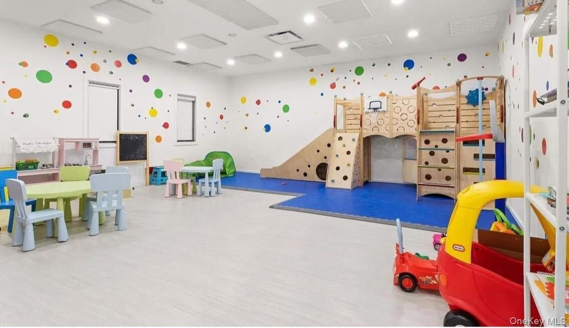 - Playroom with wallpapered walls and recessed lighting