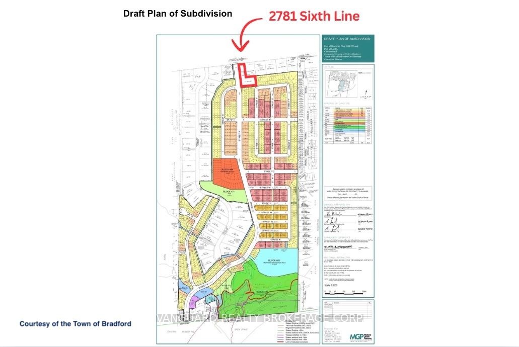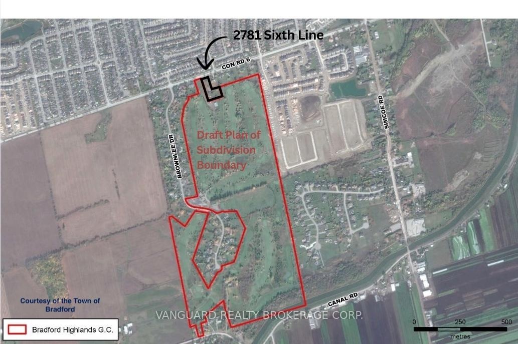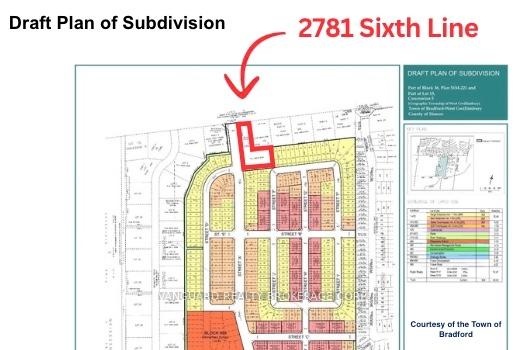 A prime investment opportunity to acquire 1.631 acres of land located at the main entrance of Bradford's largest upcoming residential subdivision with 998 homes, the Bradford Highlands(former Bradford Highlands Golf Course). This exceptional corner lot boasts over 110 feet of frontage on Sixth Line and over 427 feet along the future main entrance of the subdivision,offering high visibility and exposure. Strategically positioned within a rapidly growing community, this property presents endless potential for future development, including commercial use, a small plaza, gas station, or residential projects (subject to approvals). With ongoing residential expansion and a surging local population, this parcel offers outstanding potential for investors and developers seeking to establish a presence in one of Bradford's most desirable growth areas.Its size, location, and direct adjacency to new subdivision lands make it a valuable long-term addition to any real estate portfolio. A 5 bedroom, 2-storey home with over 2,300 sq. ft. of above-ground living space adds further value to the property ideal for rental income or as a comfortable residence while capitalizing on future development potential.