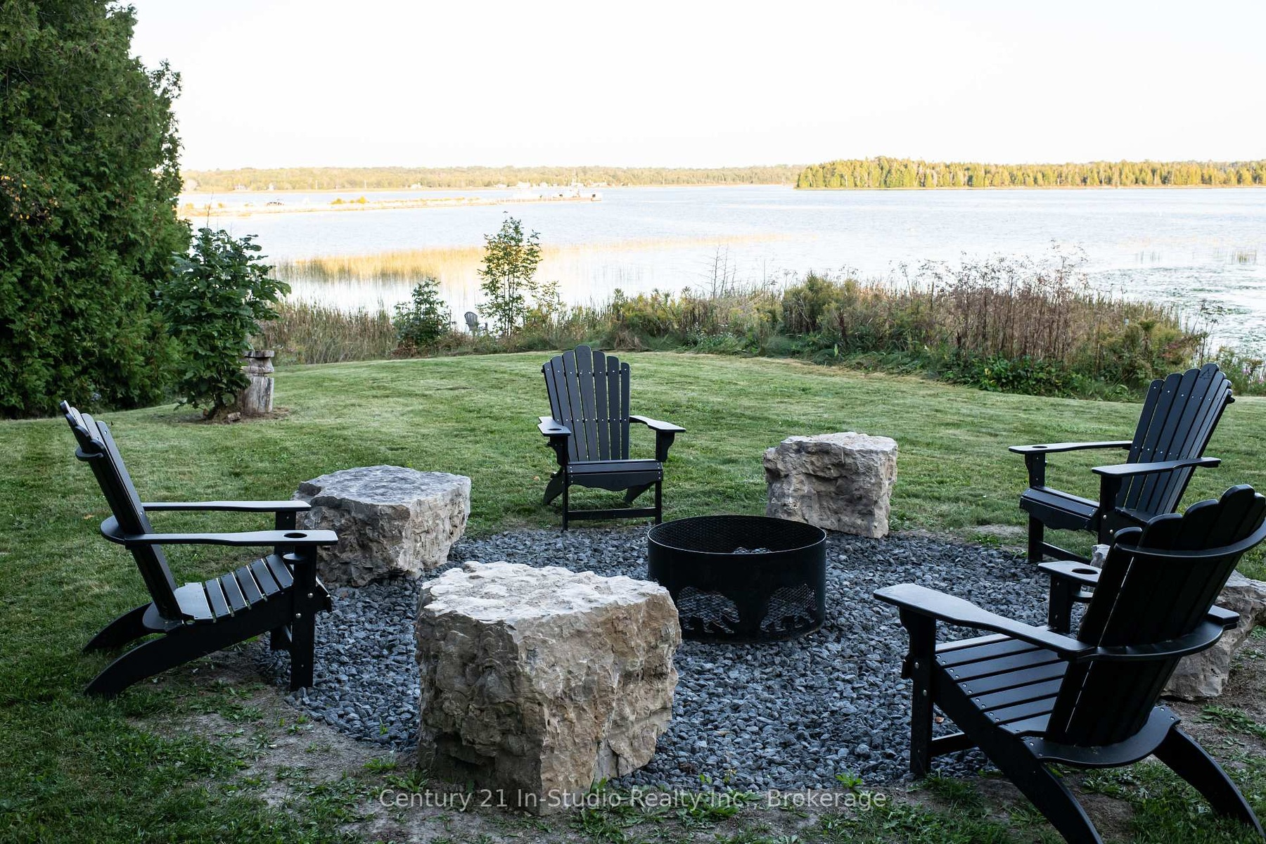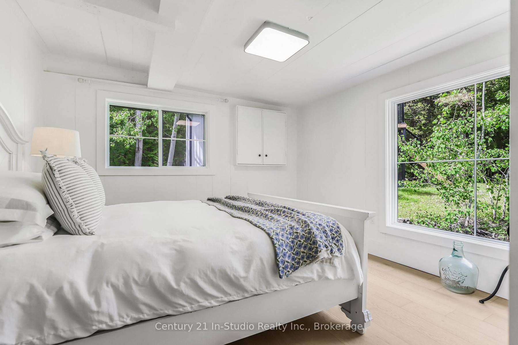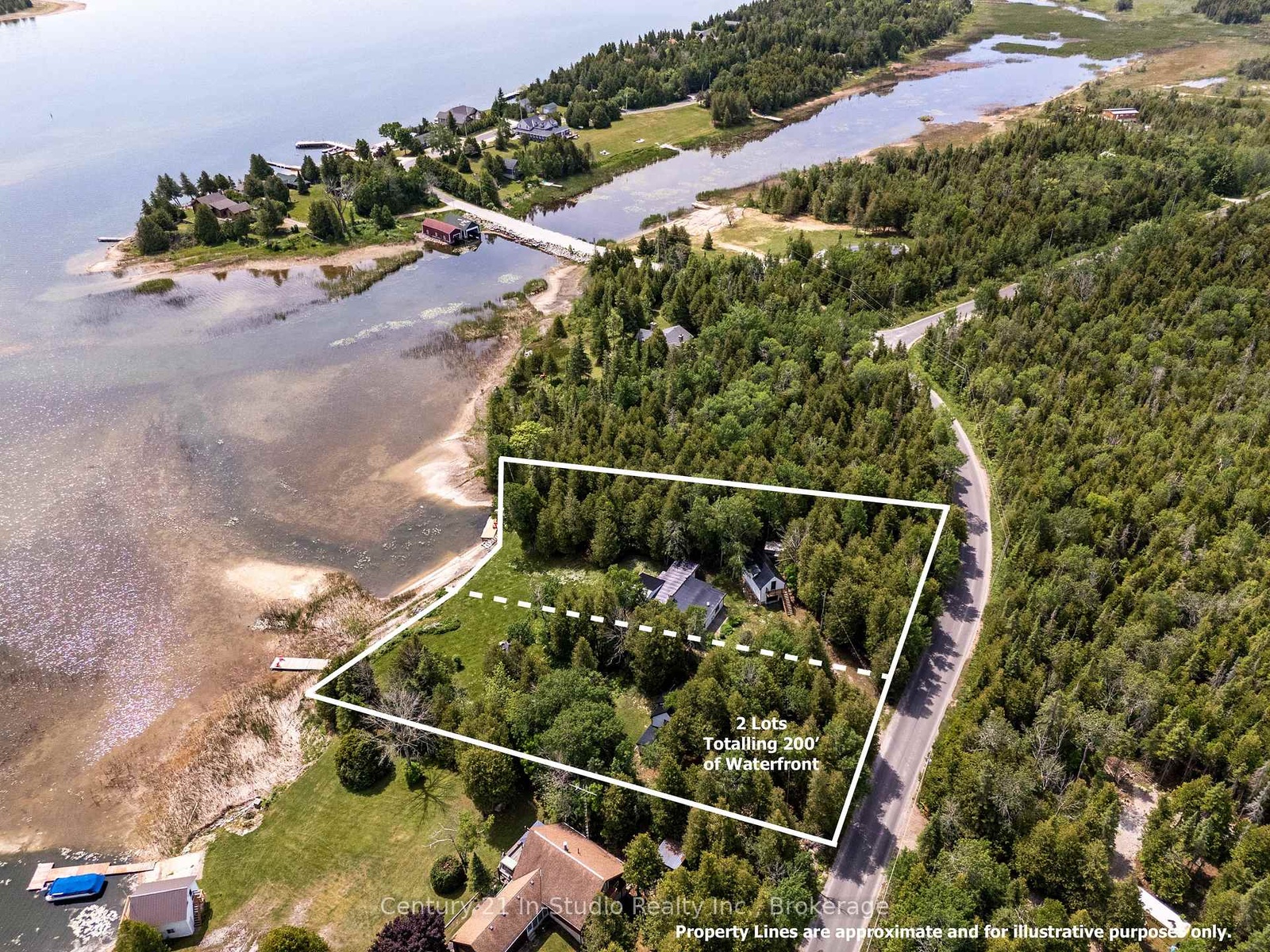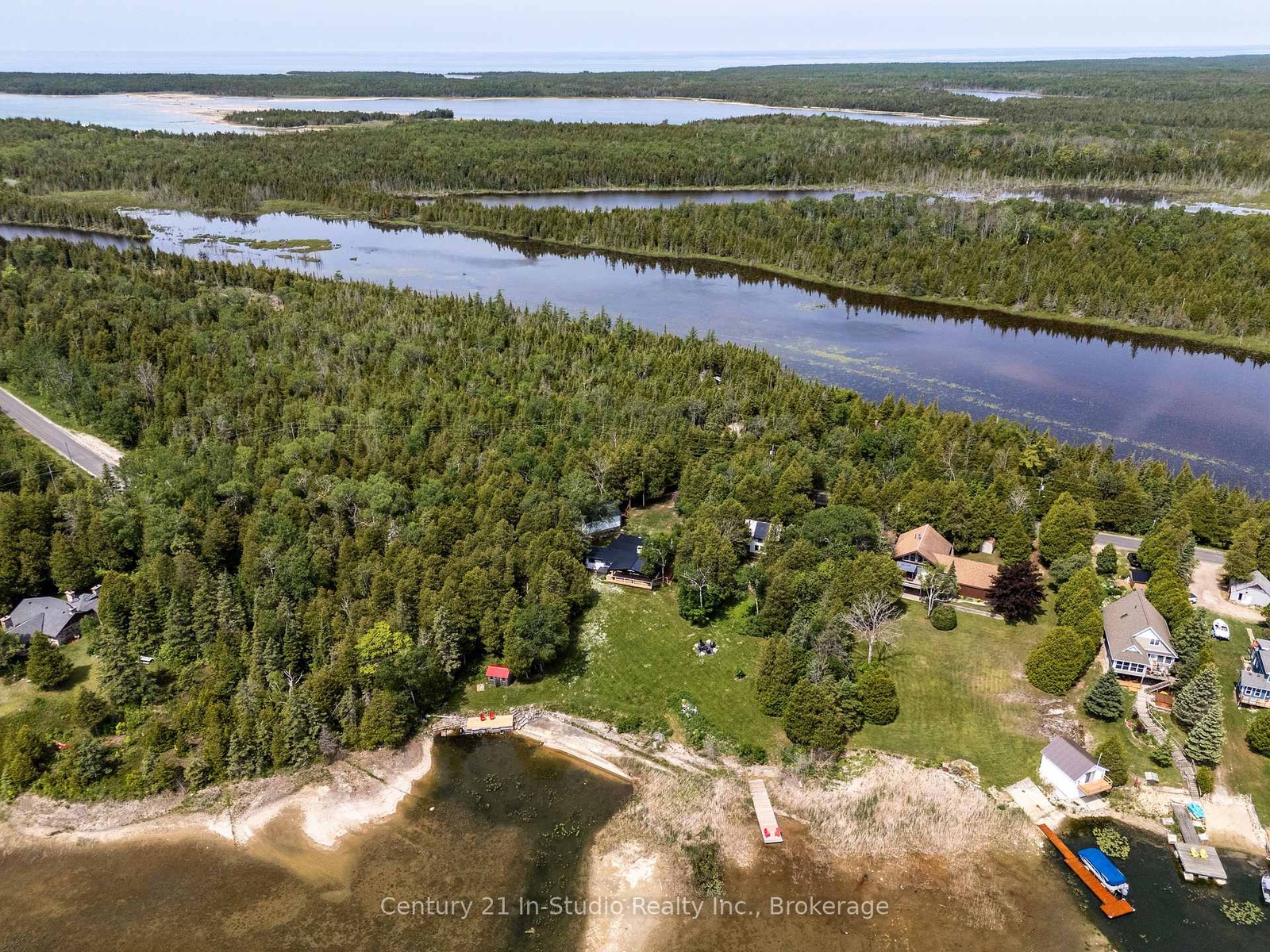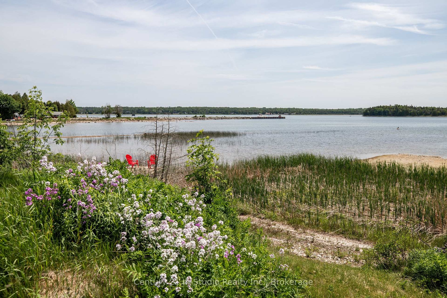 Fully updated and furnished luxury retreat on the shores of Stokes Bay. Set on 1.3 acres with 200 feet of private, deeded waterfront, this property offers two docks, two insulated and heated garages with lofts, and the option to sever into two 100 ft shoreline lots. All studies and assessments for severance are complete. The property was extensively renovated in 2024, including new insulation, electrical, plumbing, roof, windows, and doors. The interior features white oak hardwood flooring, an open-concept kitchen and living area with panoramic lake views, and walkout access to a covered deck ideal for entertaining.The primary suite includes deck access, a double steam shower ensuite, and a custom walk-in closet with Carrara marble finishes. Additional bedrooms and bathroom are well designed for family and guests, all updated with modern fixtures and finishes. Thoughtfully preserved original details stone accents and whitewashed wood beams add stunning charm. Two detached heated garages (24' x 14' and 27' x 13') feature epoxy marble floors and lofts for extra living or storage space - ideal for guest accommodation, office use, or hobby areas. Outdoors, enjoy an expansive private yard, new hot tub, and beautiful Lake Huron views. The double-lot configuration offers future investment potential for development, resale, or a multi-family retreat. This property combines modern construction, privacy, and waterfront lifestyle - ready for year-round living or as a high-end seasonal escape!