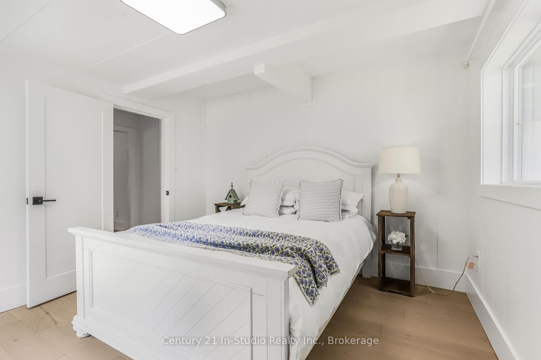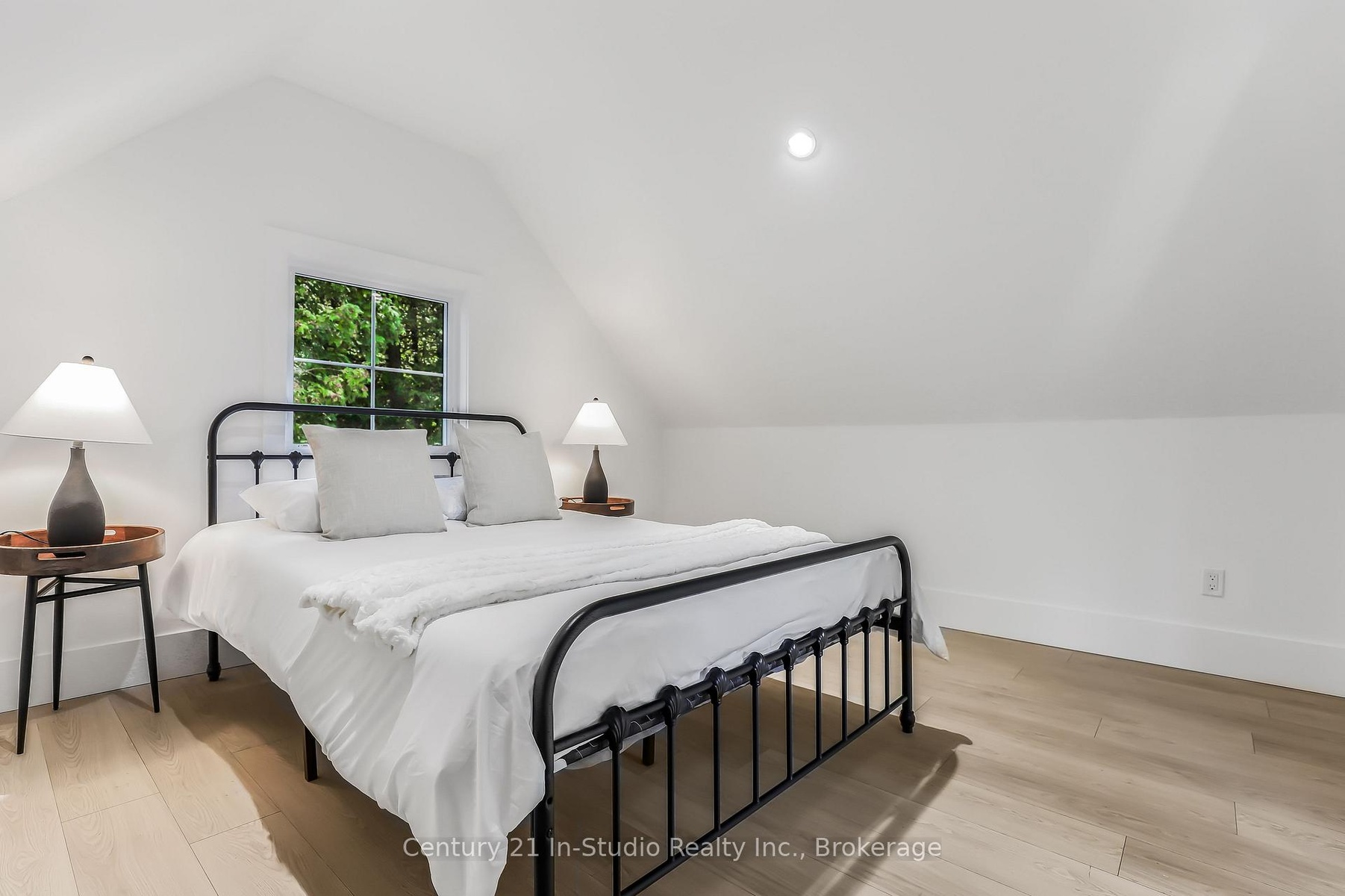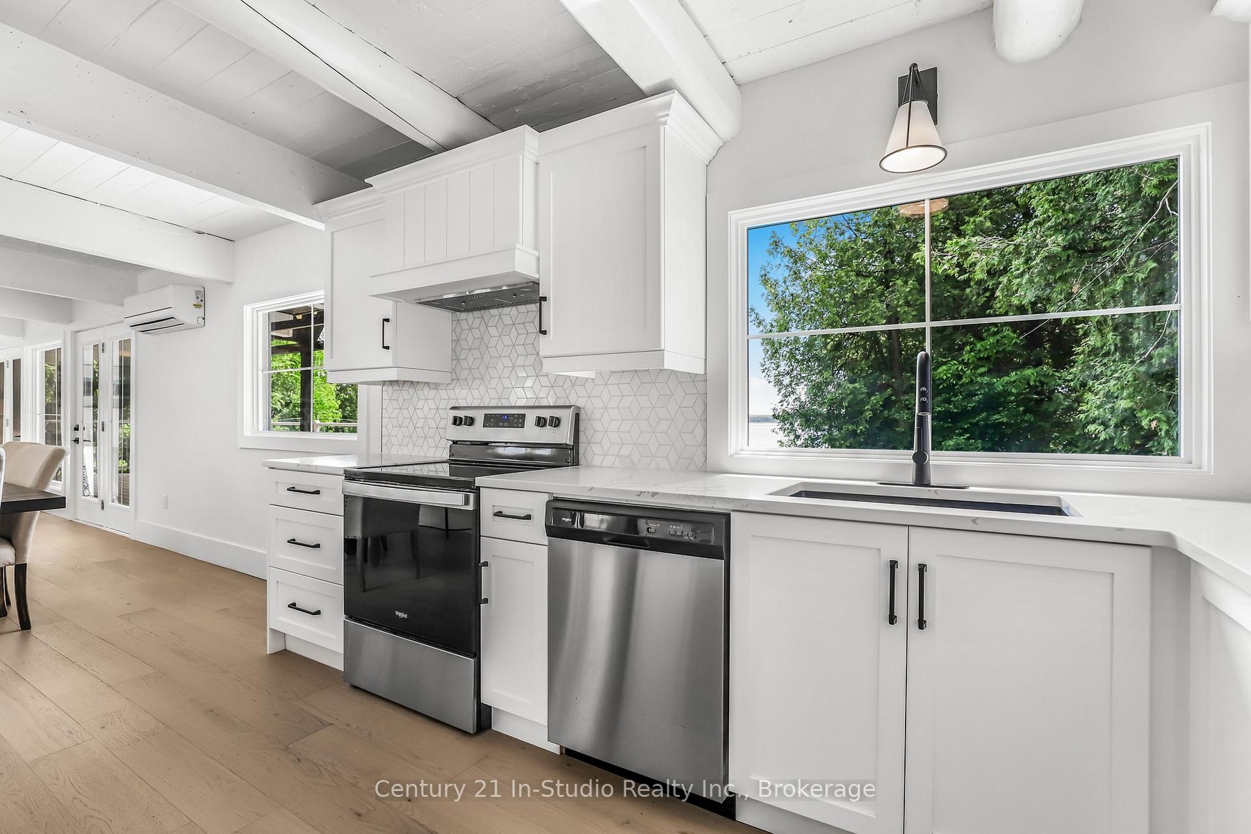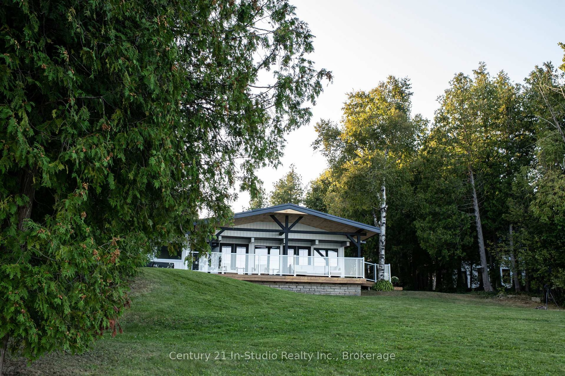 Fully updated and furnished luxury retreat on the shores of Stokes Bay. Set on 1.3 acres with 200 feet of private, deeded waterfront, this property offers two docks, two insulated and heated garages with lofts, and the option to sever into two 100 ft shoreline lots. All studies and assessments for severance are complete. The property was extensively renovated in 2024, including new insulation, electrical, plumbing, roof, windows, and doors. The interior features white oak hardwood flooring, an open-concept kitchen and living area with panoramic lake views, and walkout access to a covered deck ideal for entertaining.The primary suite includes deck access, a double steam shower ensuite, and a custom walk-in closet with Carrara marble finishes. Additional bedrooms and bathroom are well designed for family and guests, all updated with modern fixtures and finishes. Thoughtfully preserved original details stone accents and whitewashed wood beams add stunning charm. Two detached heated garages (24' x 14' and 27' x 13') feature epoxy marble floors and lofts for extra living or storage space - ideal for guest accommodation, office use, or hobby areas. Outdoors, enjoy an expansive private yard, new hot tub, and beautiful Lake Huron views. The double-lot configuration offers future investment potential for development, resale, or a multi-family retreat. This property combines modern construction, privacy, and waterfront lifestyle - ready for year-round living or as a high-end seasonal escape!