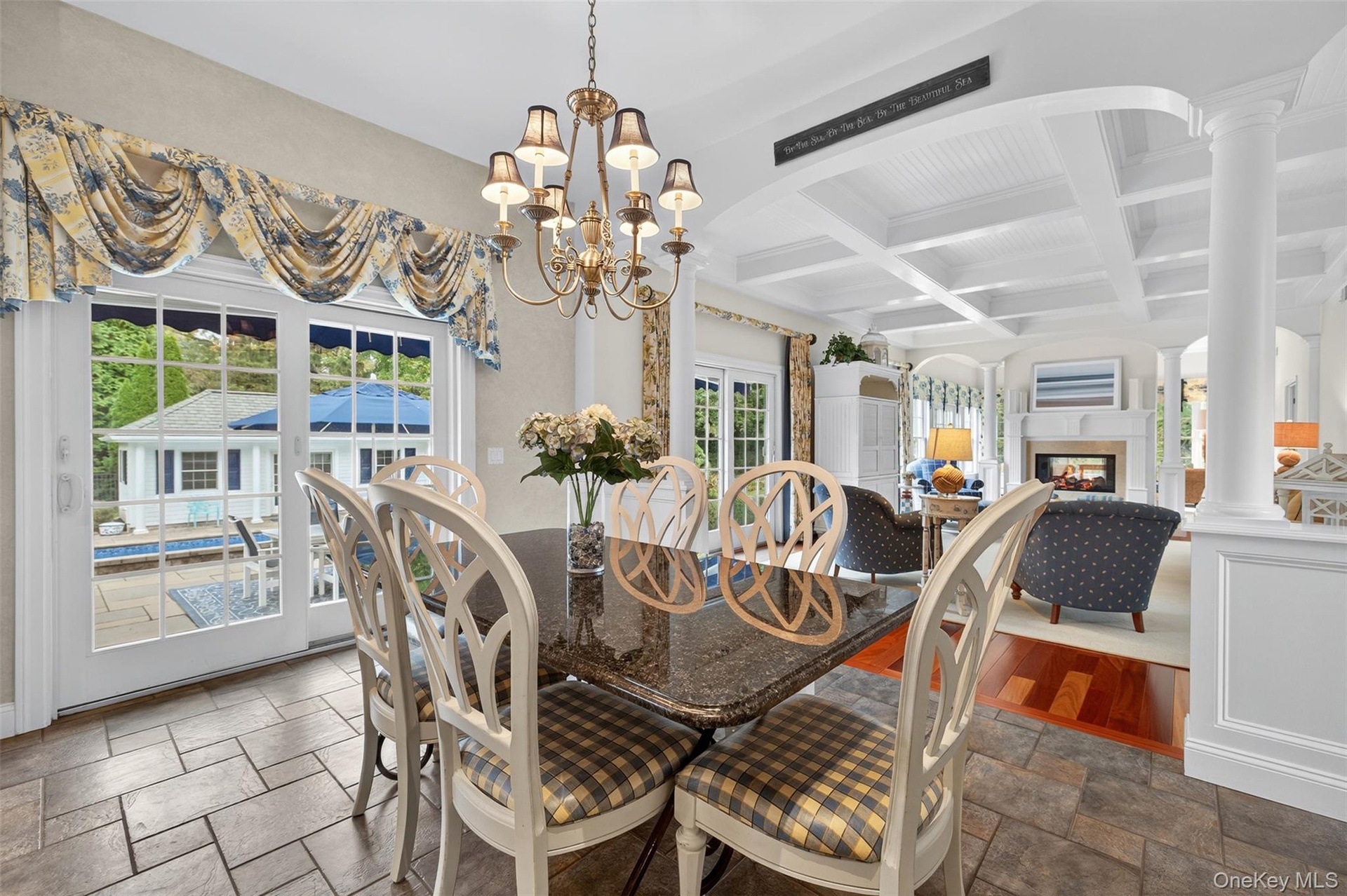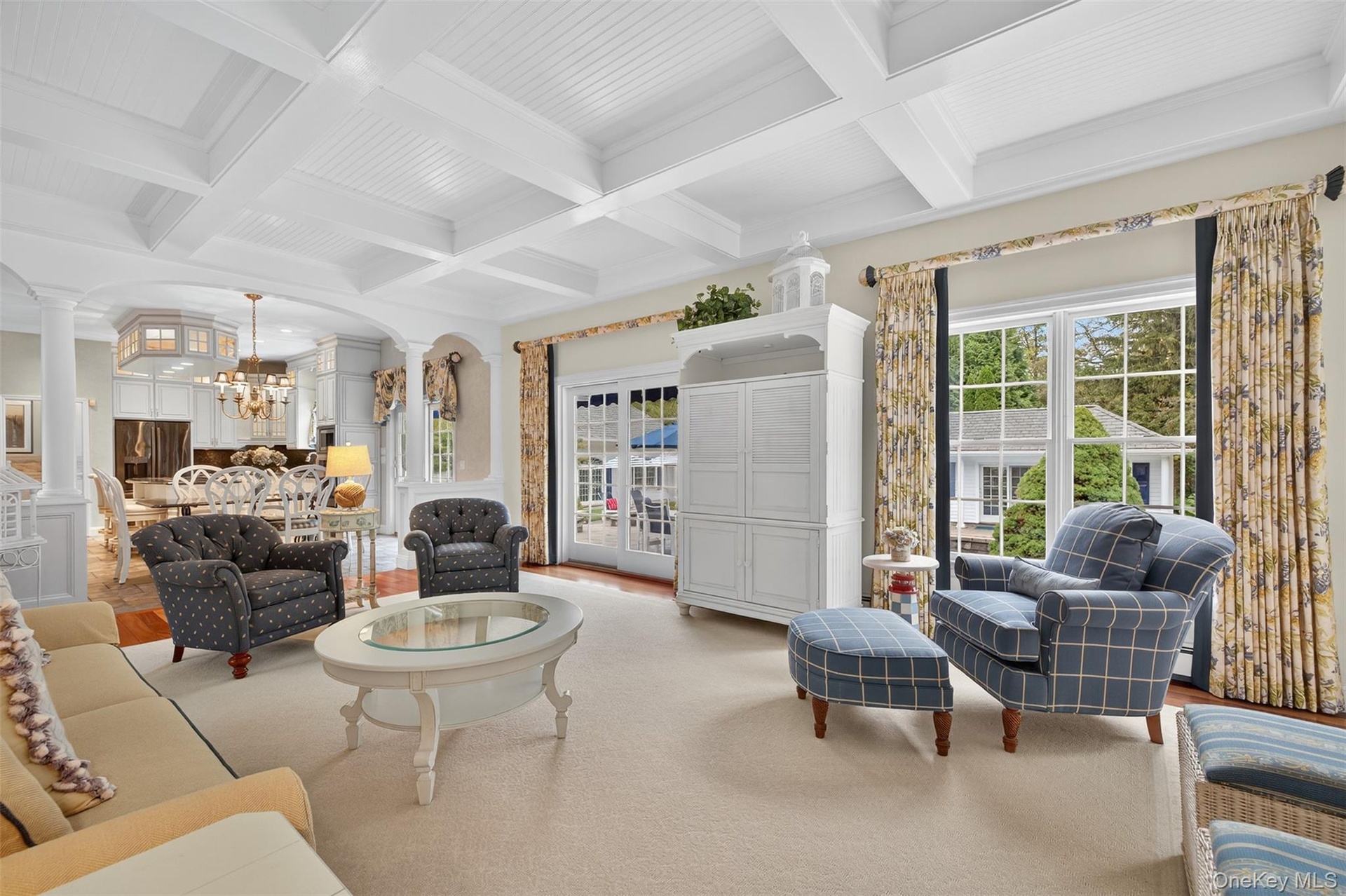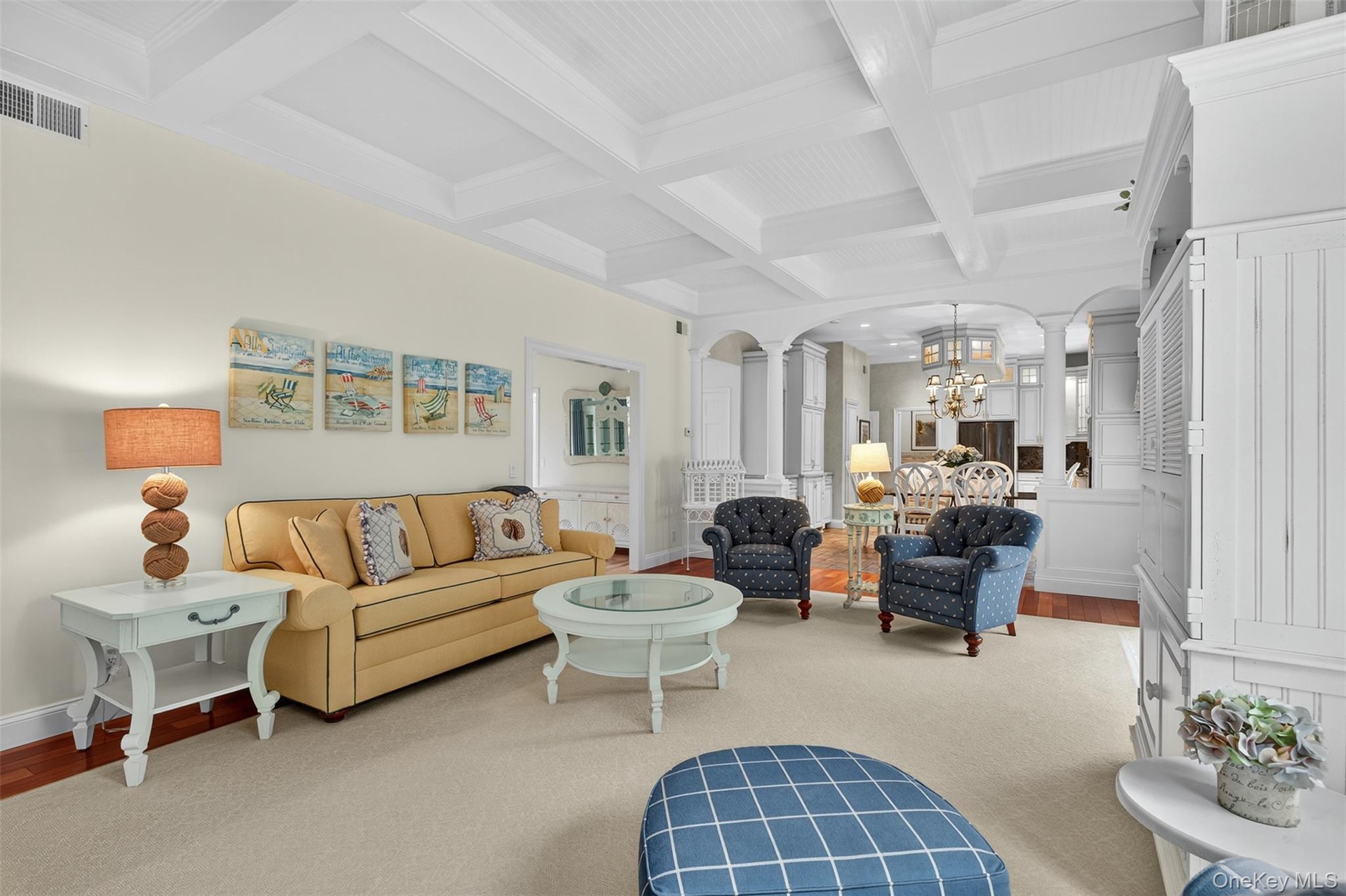 - Living area featuring decorative columns, beamed ceiling, coffered ceiling, a chandelier, and arched walkways