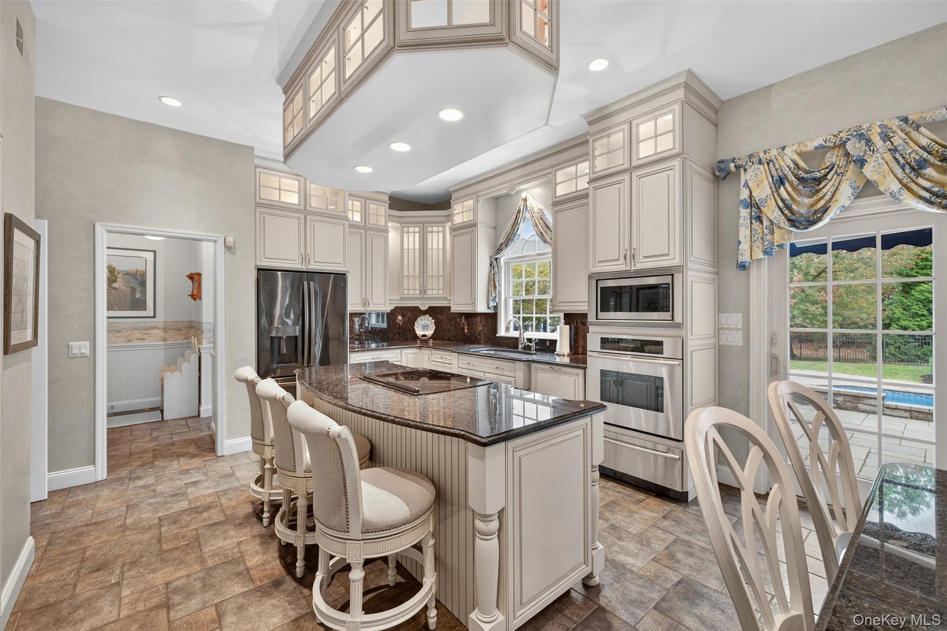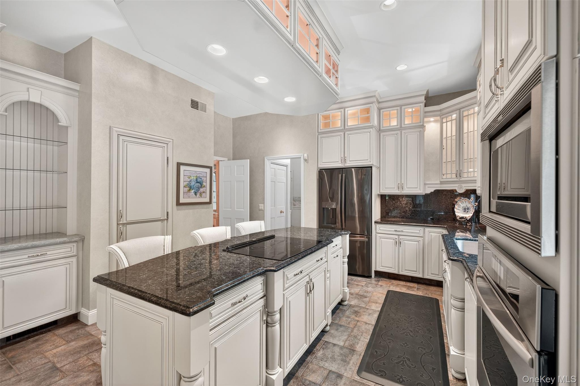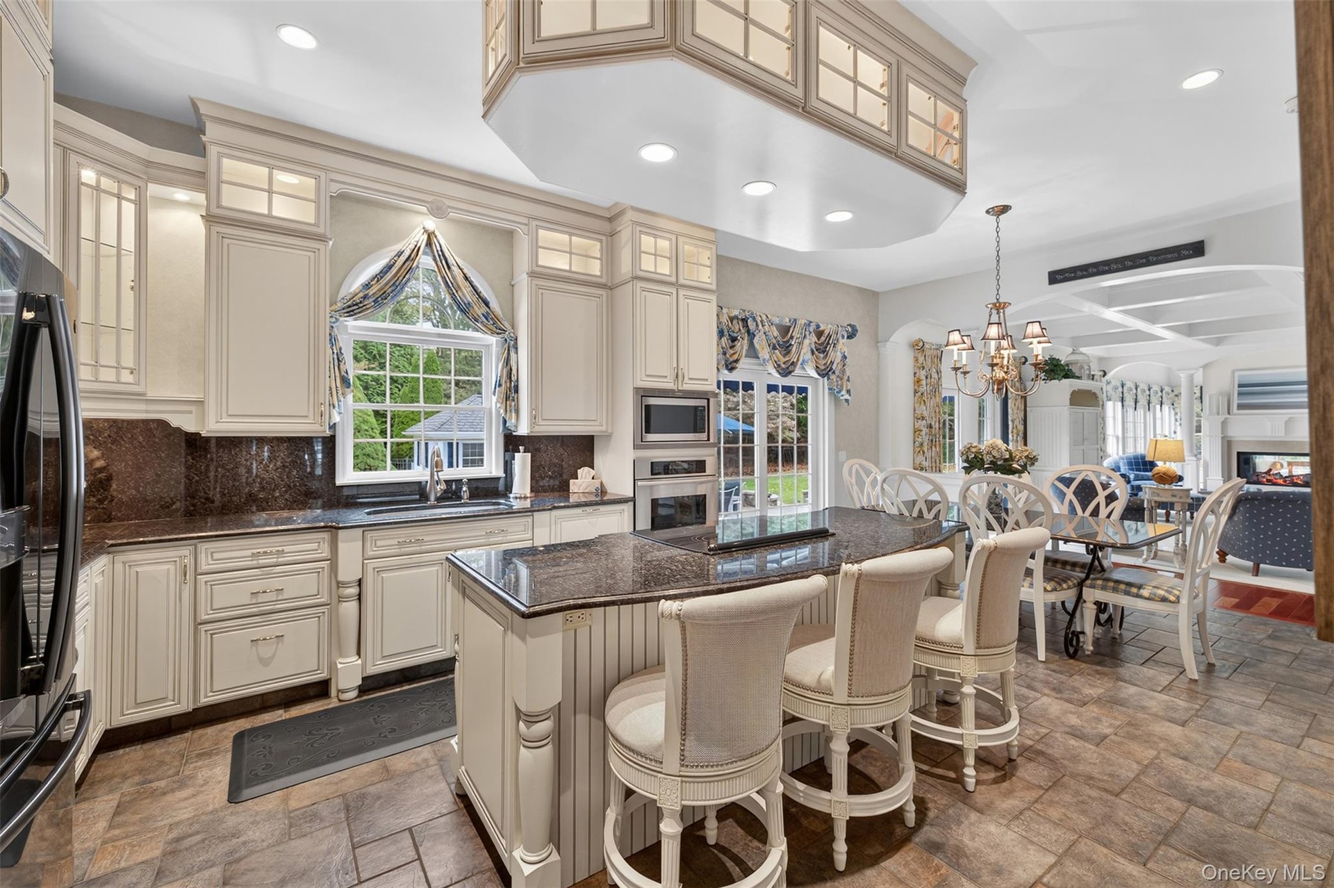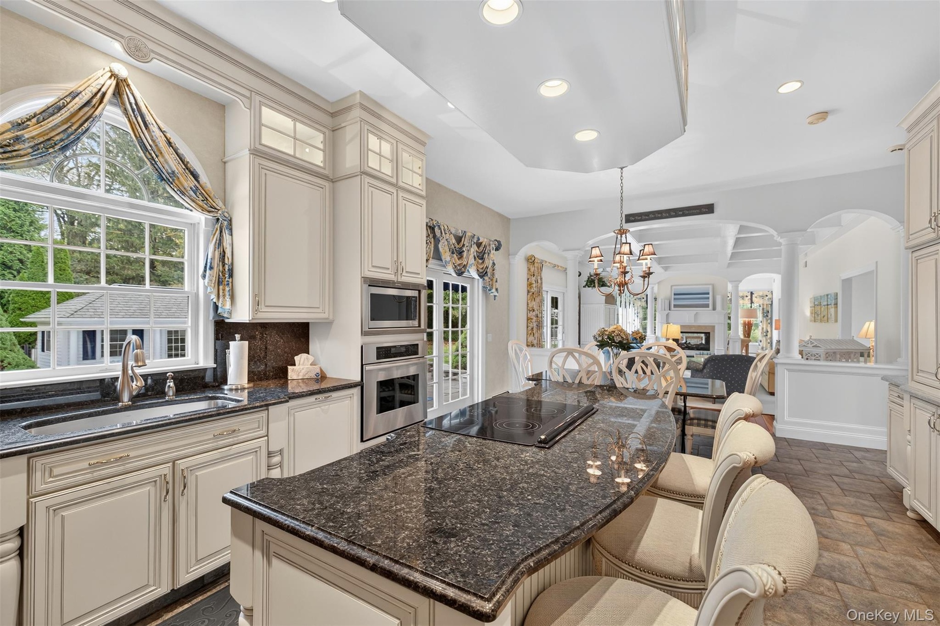 - Kitchen with arched walkways, dark stone counters, cream cabinets, open floor plan, and recessed lighting