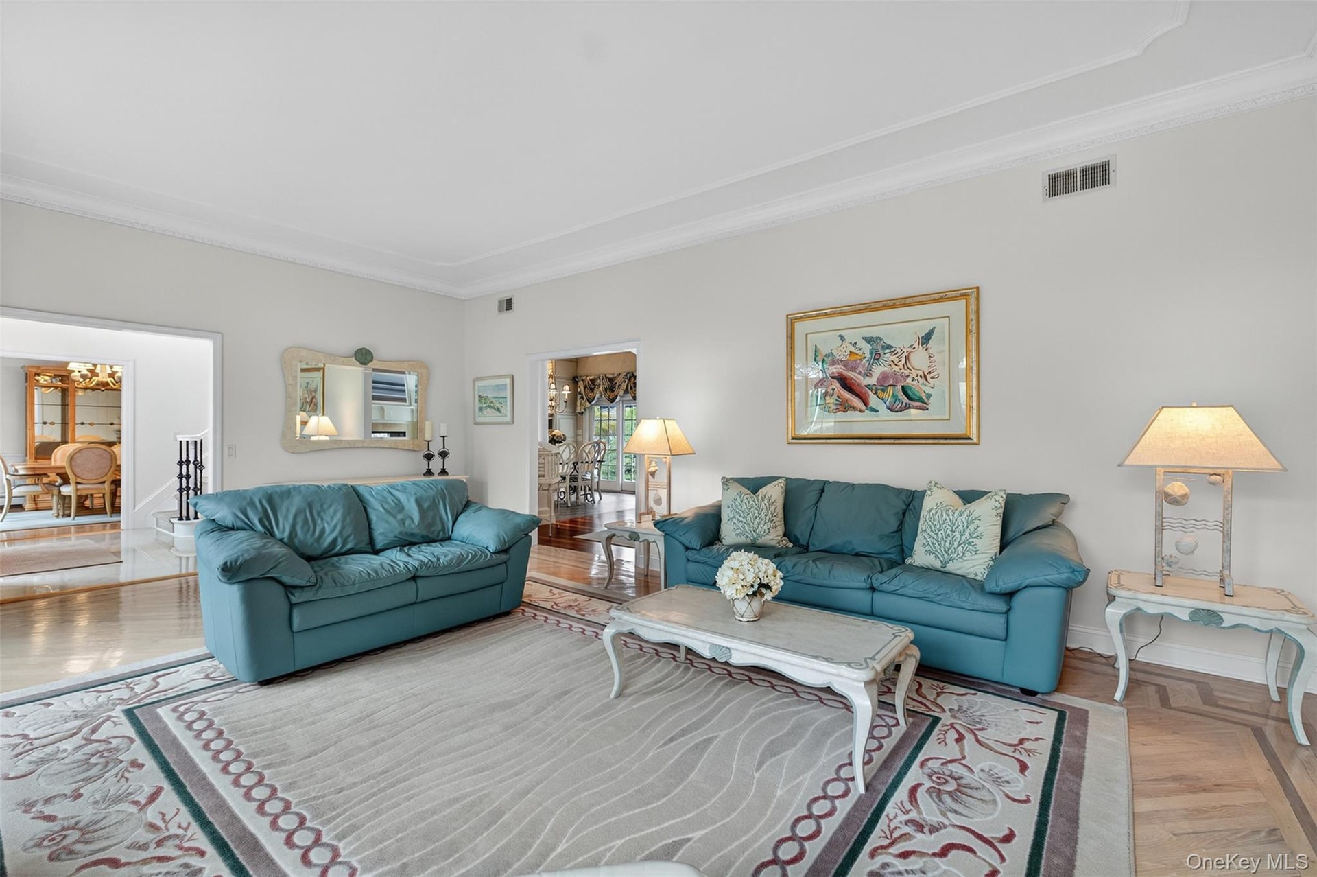 - Living room featuring a chandelier, crown molding, and parquet flooring