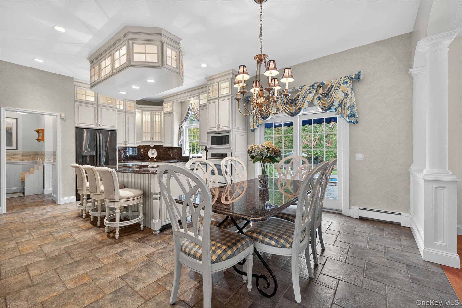 - Dining space with plenty of natural light, decorative columns, baseboard heating, a chandelier, and recessed lighting