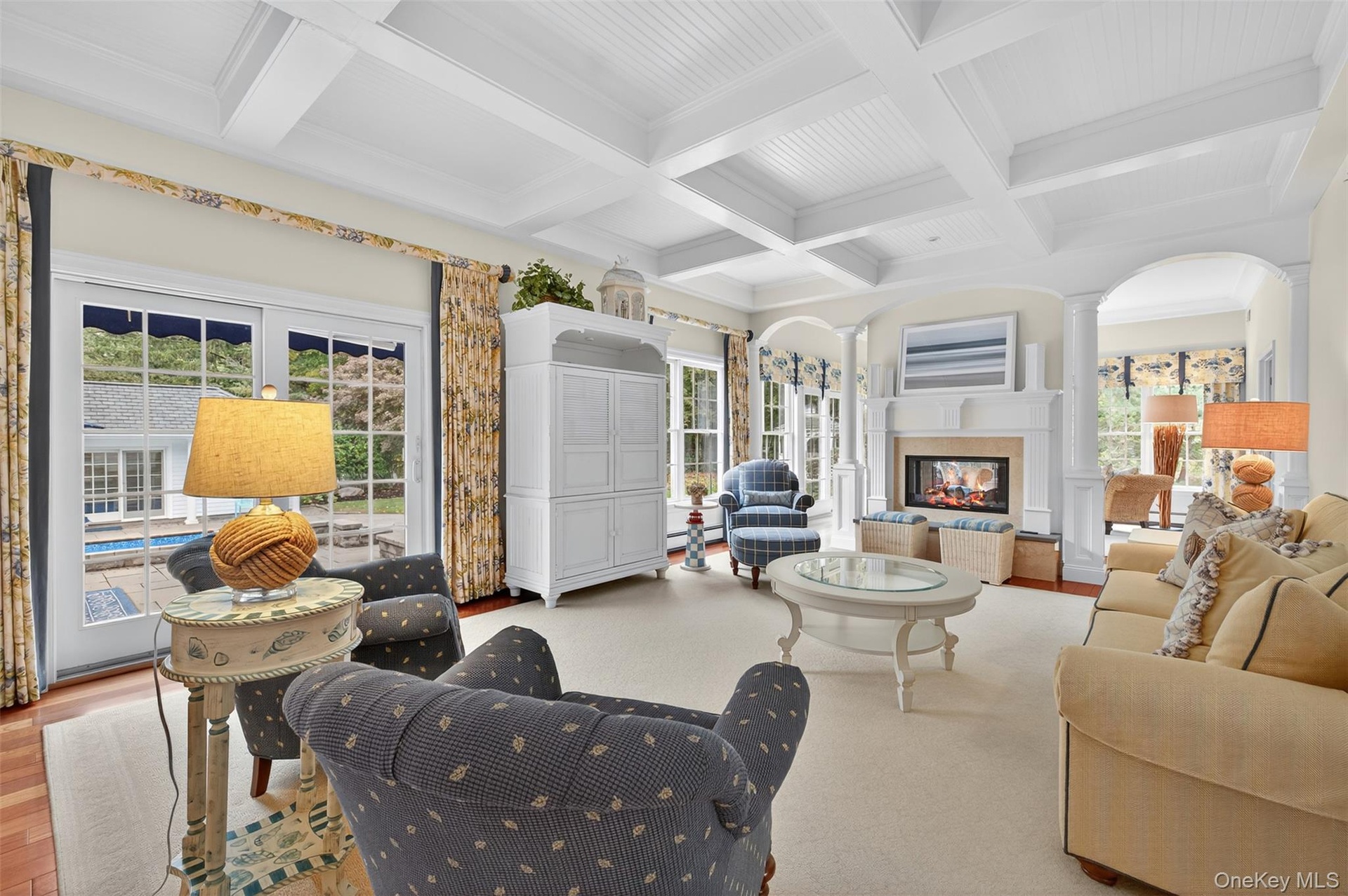 - Living area with beamed ceiling, coffered ceiling, a multi sided fireplace, arched walkways, and ornate columns
