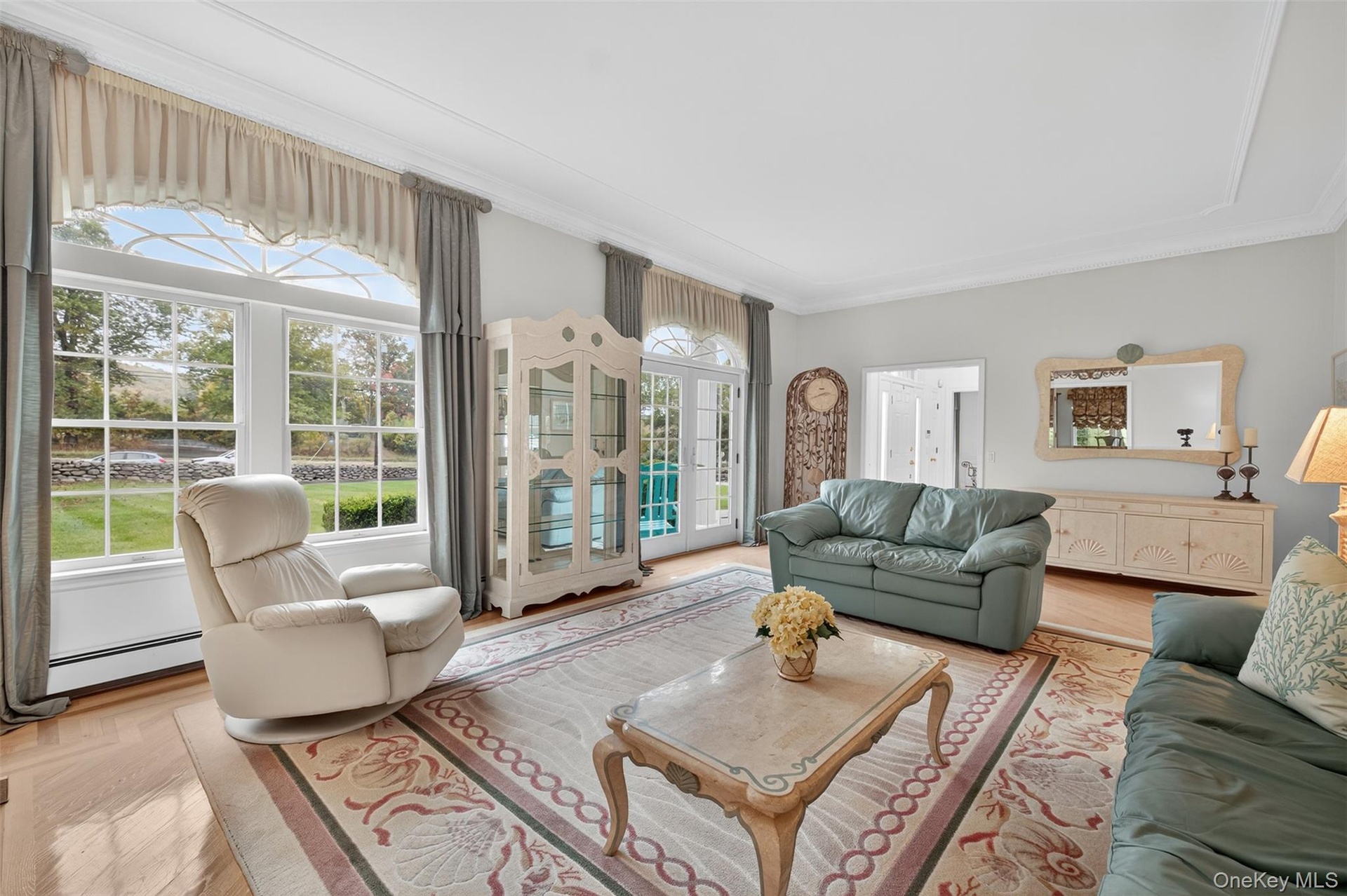 - Living room featuring ornamental molding and a baseboard radiator