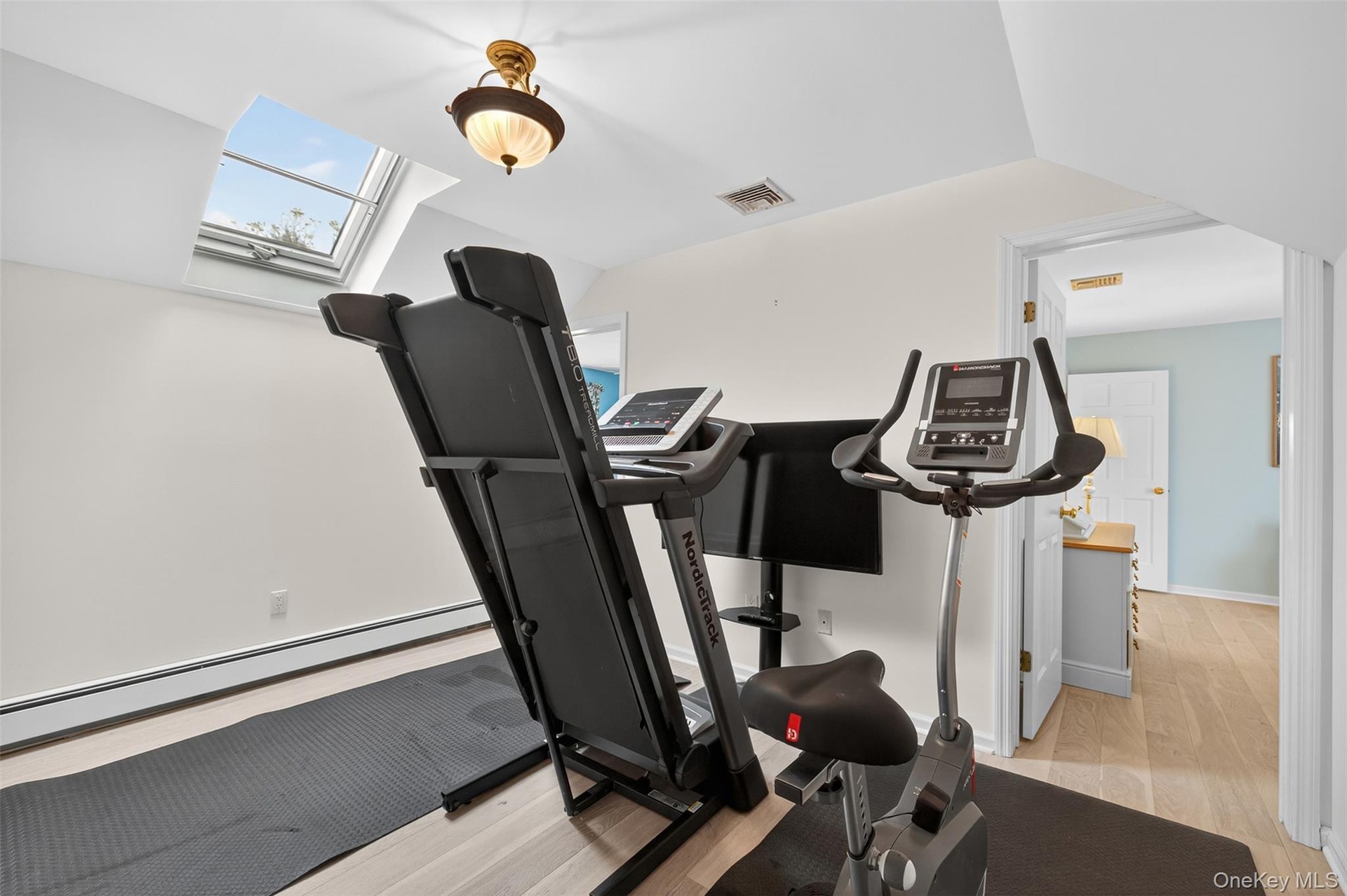 - Workout room featuring light wood finished floors, a skylight, and a baseboard heating unit