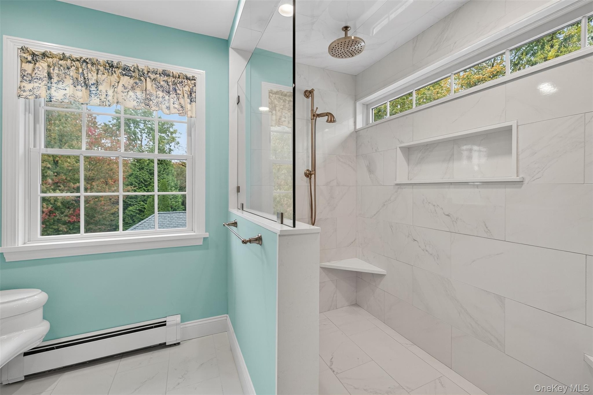 - Bathroom with a baseboard radiator, walk in shower, and marble look tile flooring