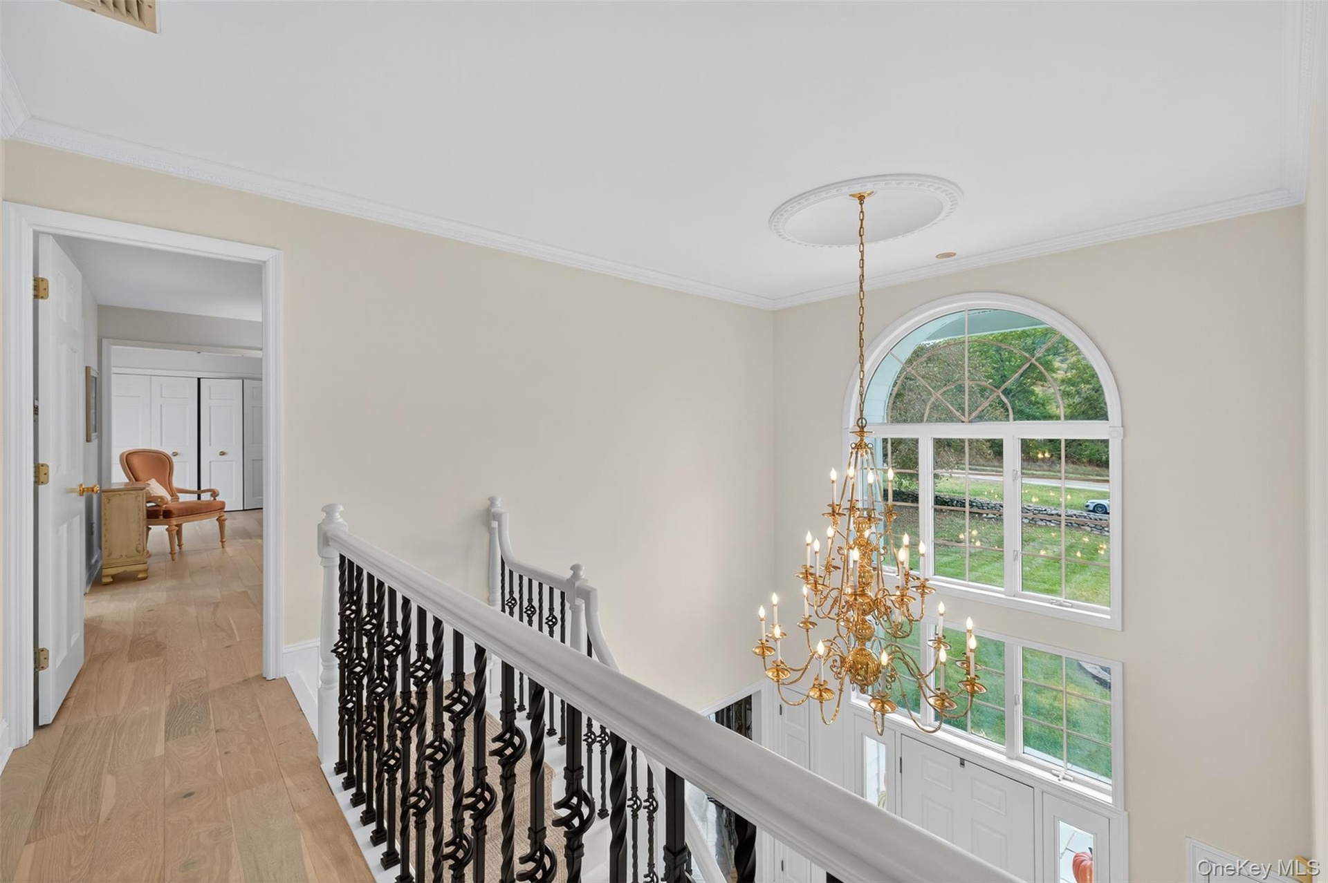 - Hall featuring crown molding, light wood-style floors, a chandelier, and an upstairs landing
