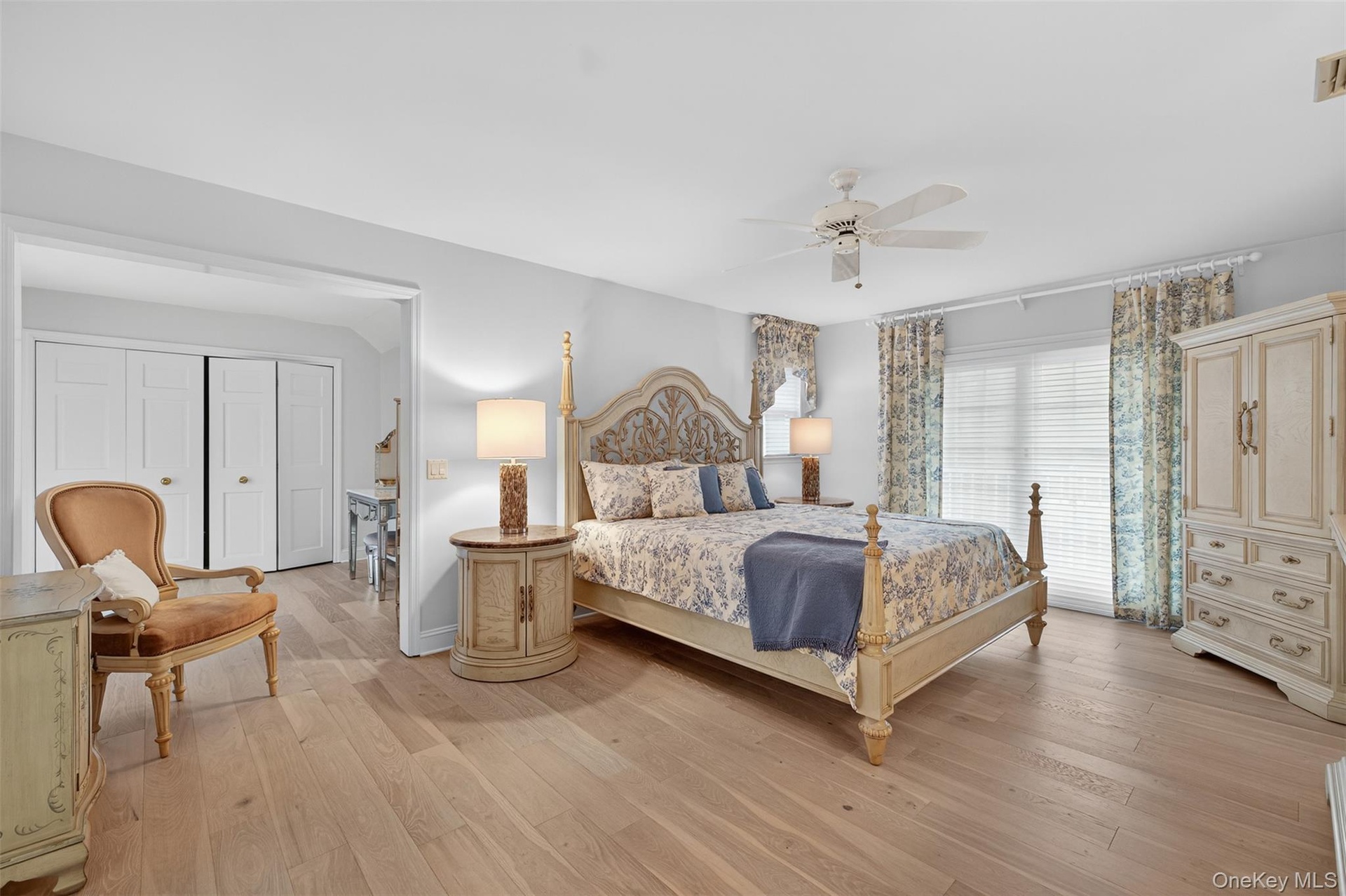 - Bedroom with light wood finished floors and a ceiling fan