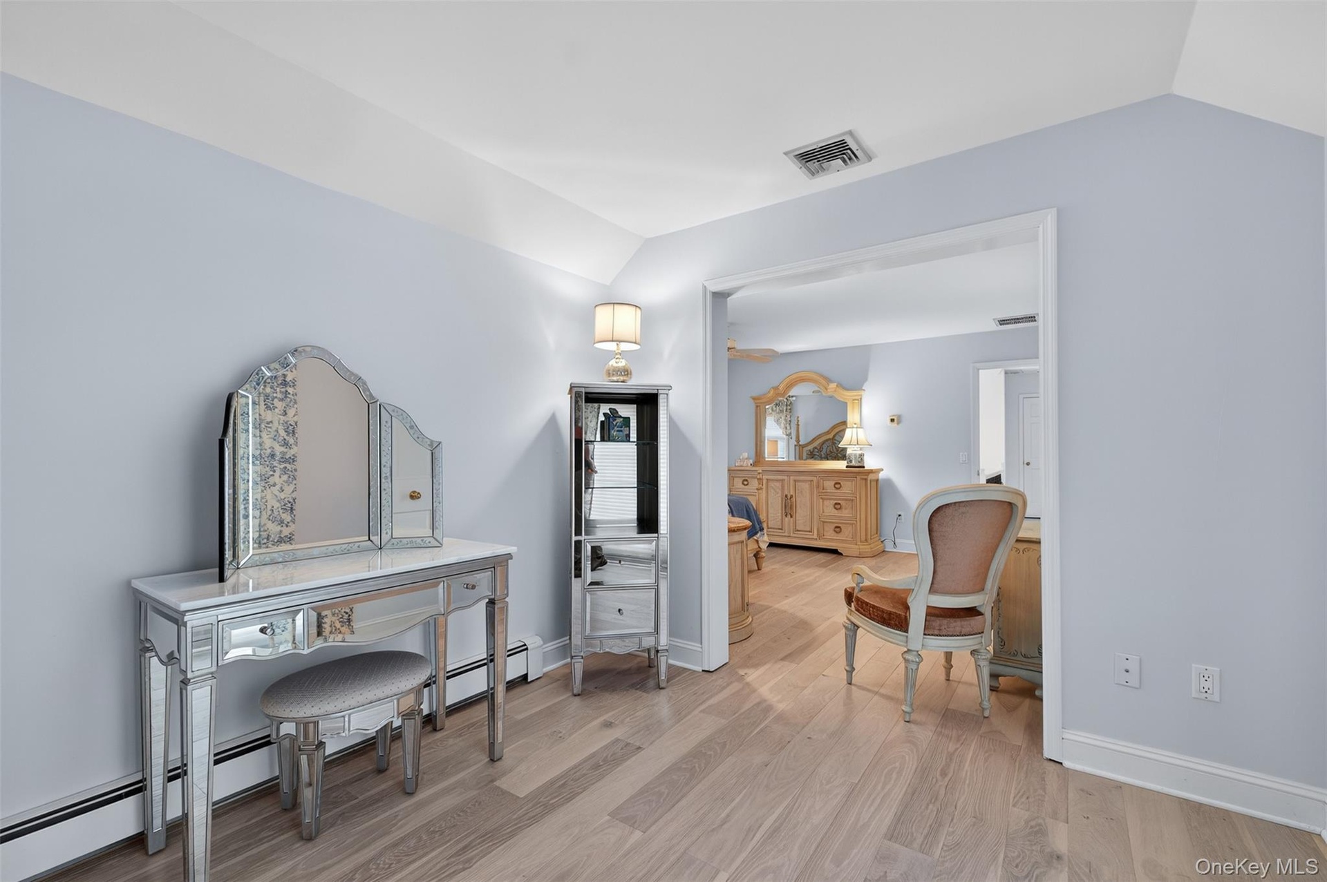 - Sitting room featuring a baseboard radiator, light wood finished floors, and lofted ceiling