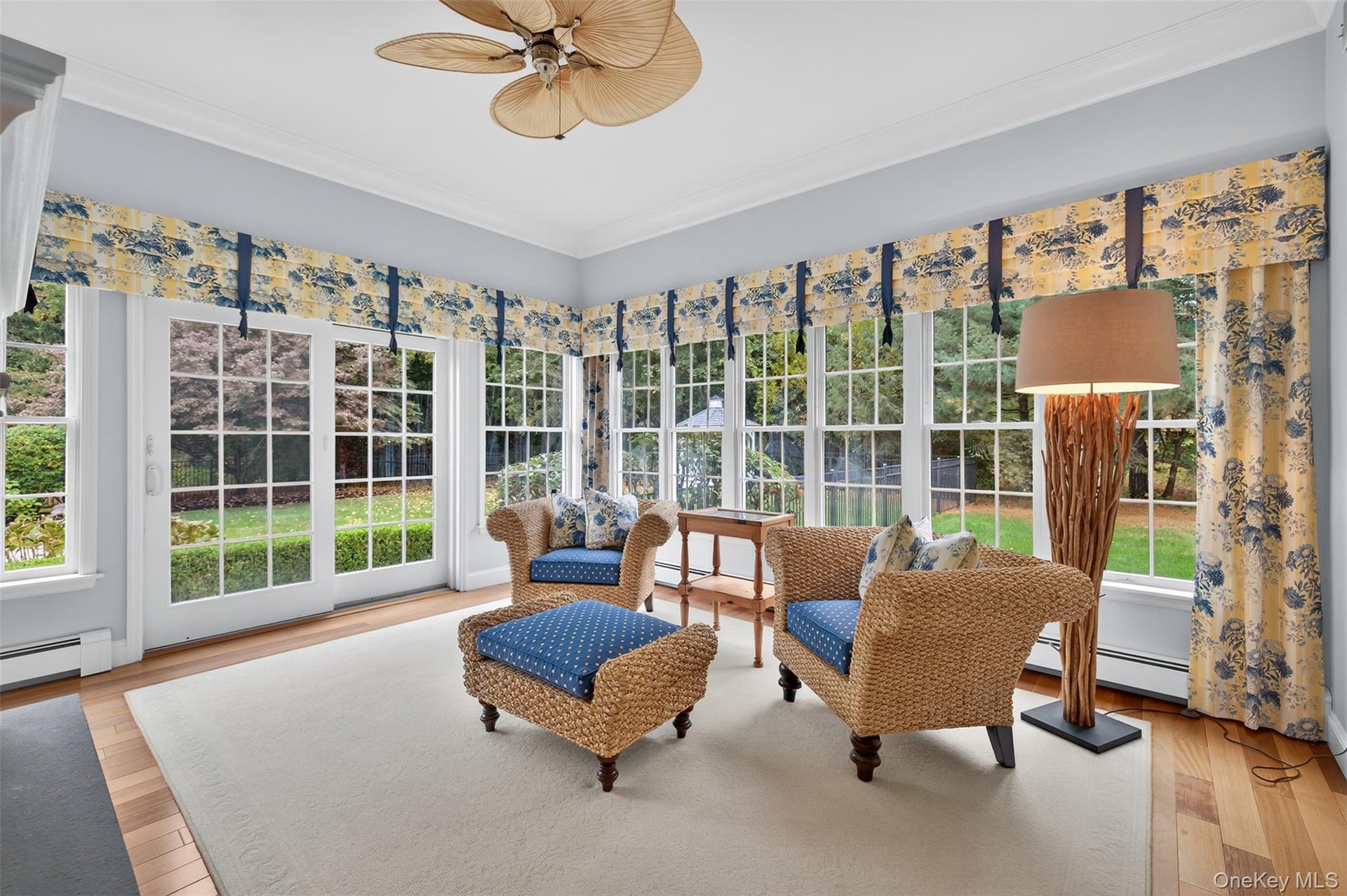- Sunroom / solarium with wood finished floors, ornamental molding, and a baseboard heating unit