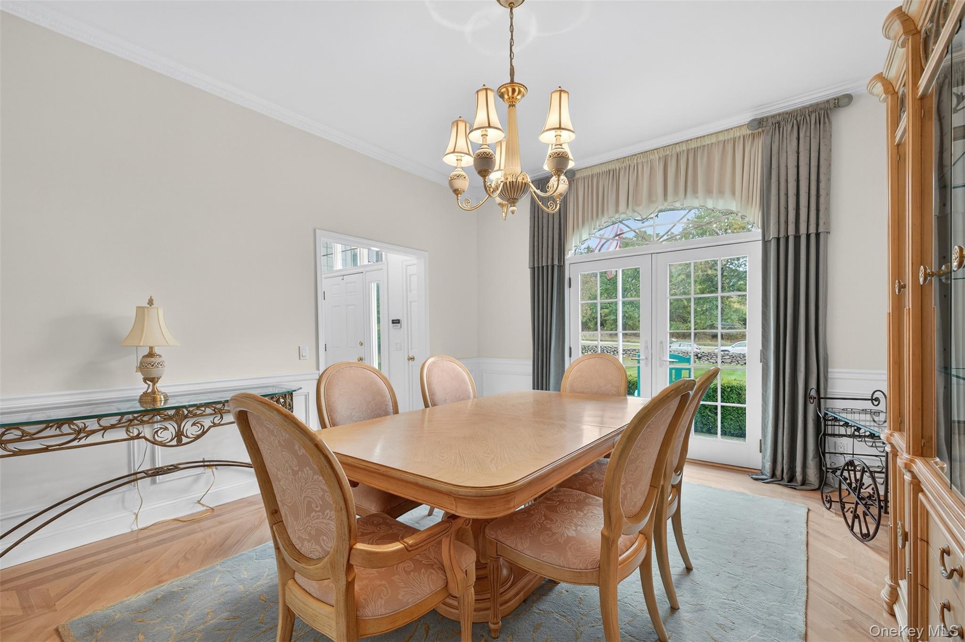 - Dining area with wainscoting, crown molding, french doors, a chandelier, and a decorative wall
