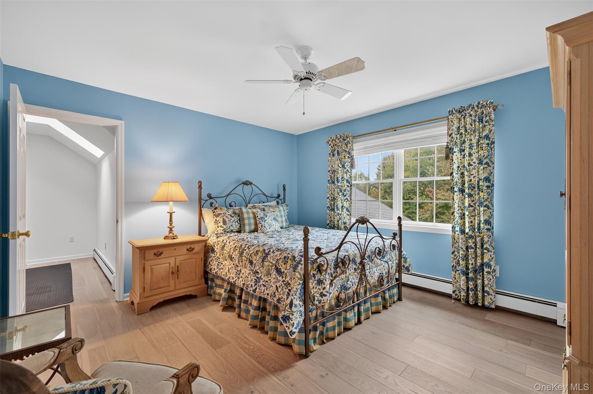 - Bedroom with light wood-style flooring, a baseboard radiator, and a ceiling fan