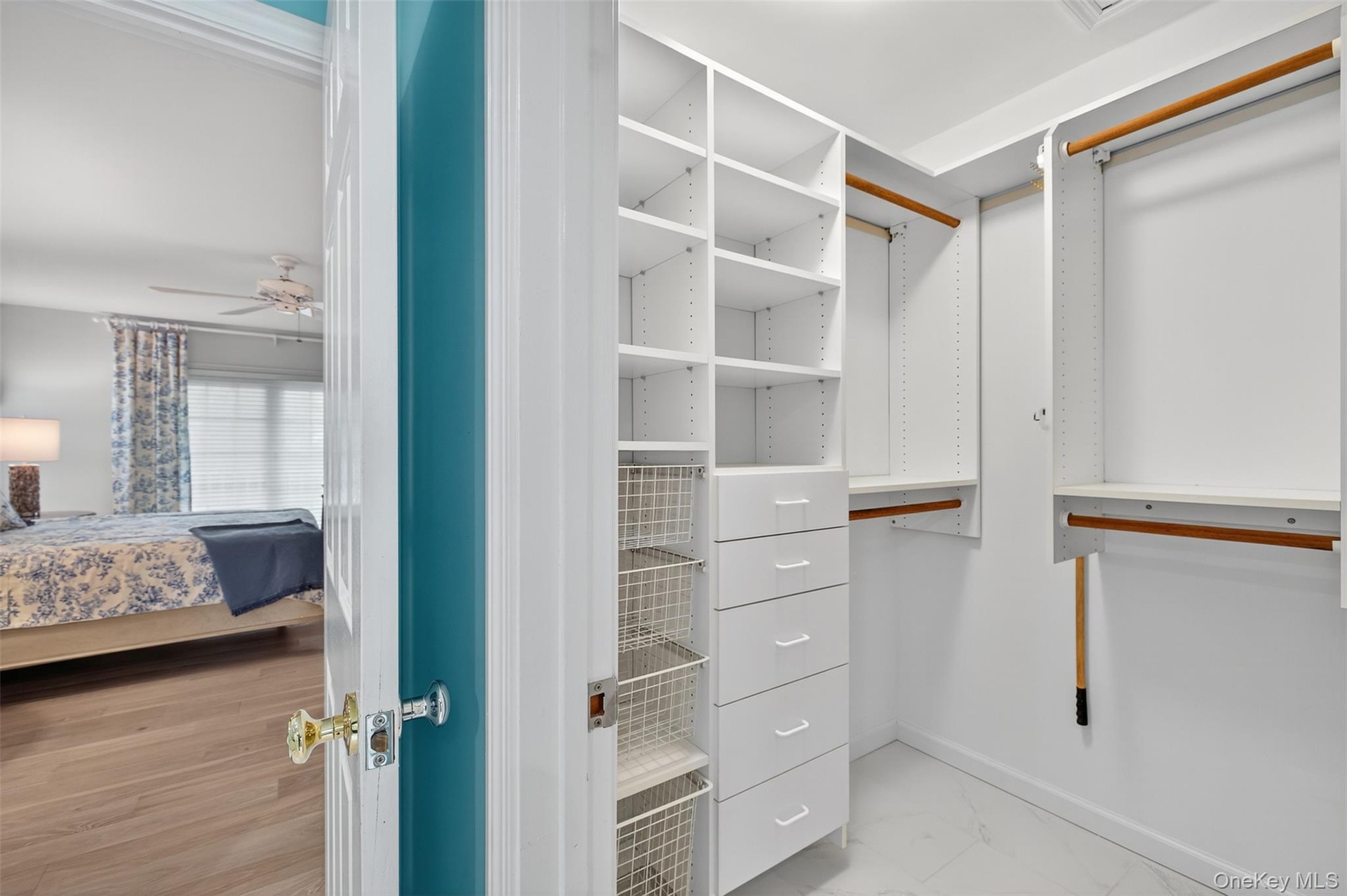 - Walk in closet featuring light marble finish floors and ceiling fan