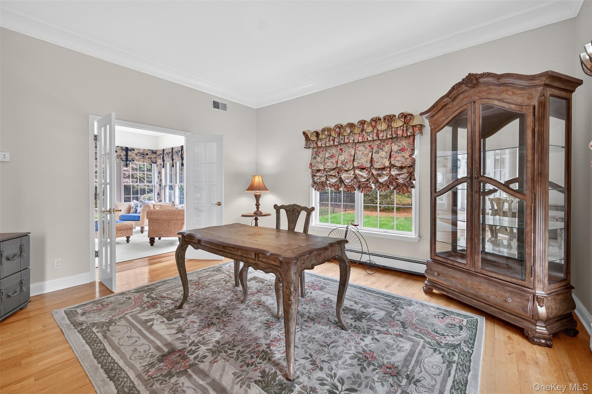 - Office with ornamental molding, light wood-type flooring, french doors, and a baseboard radiator
