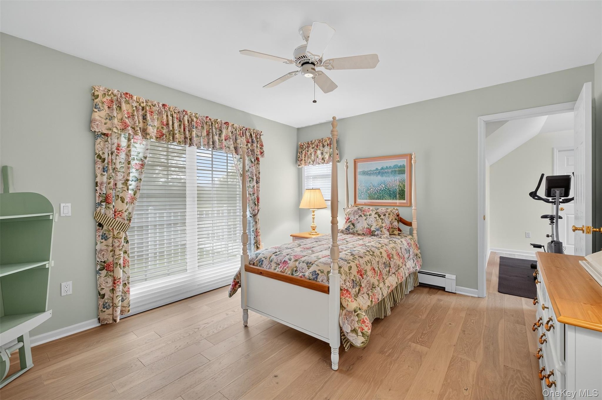 - Bedroom featuring light wood-style floors, a ceiling fan, and a baseboard heating unit