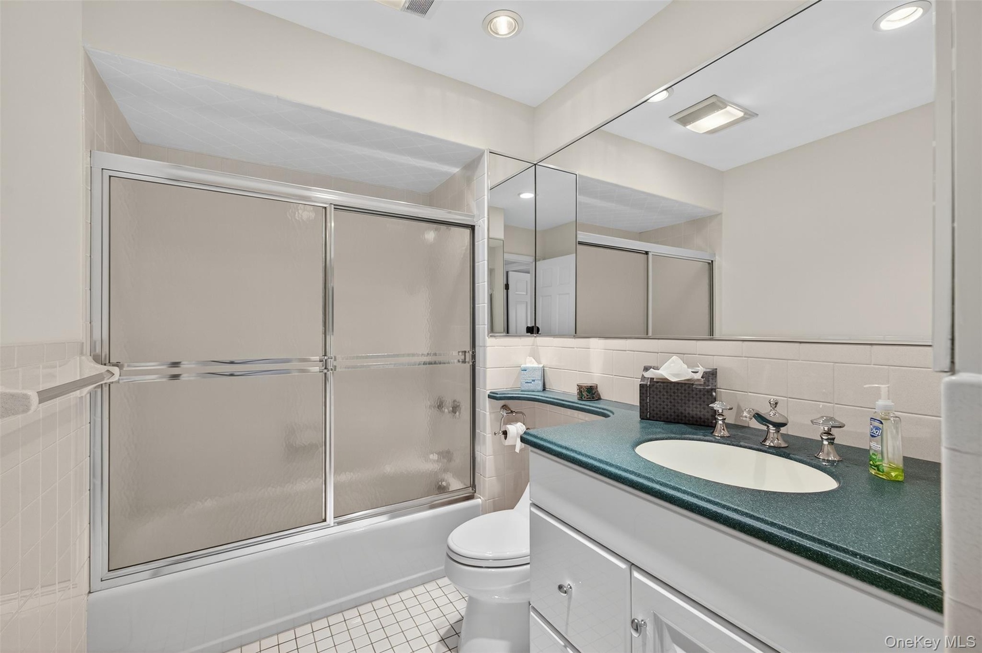 - Bathroom featuring vanity, bath / shower combo with glass door, light tile patterned floors, decorative backsplash, and recessed lighting