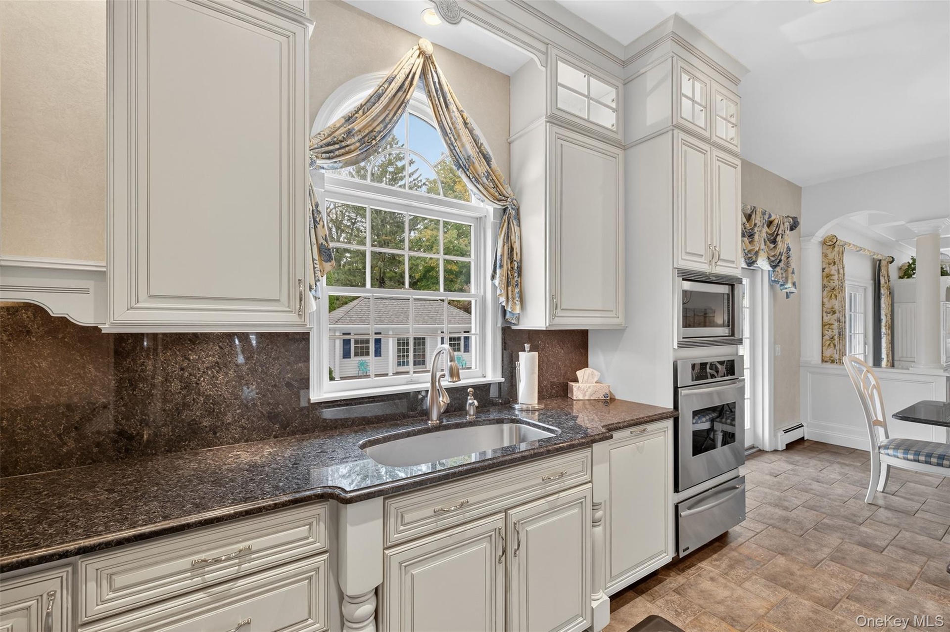 - Kitchen featuring arched walkways, dark stone counters, stainless steel appliances, tasteful backsplash, and a warming drawer