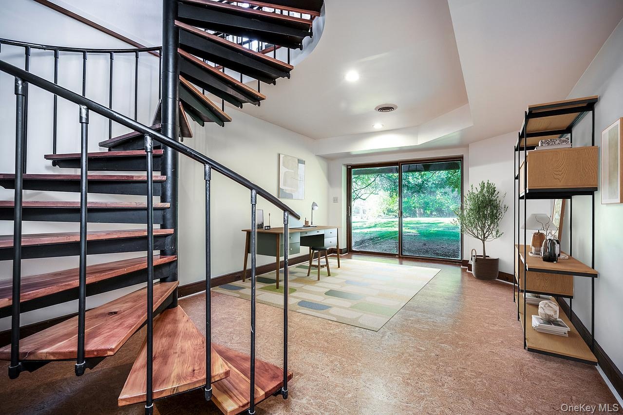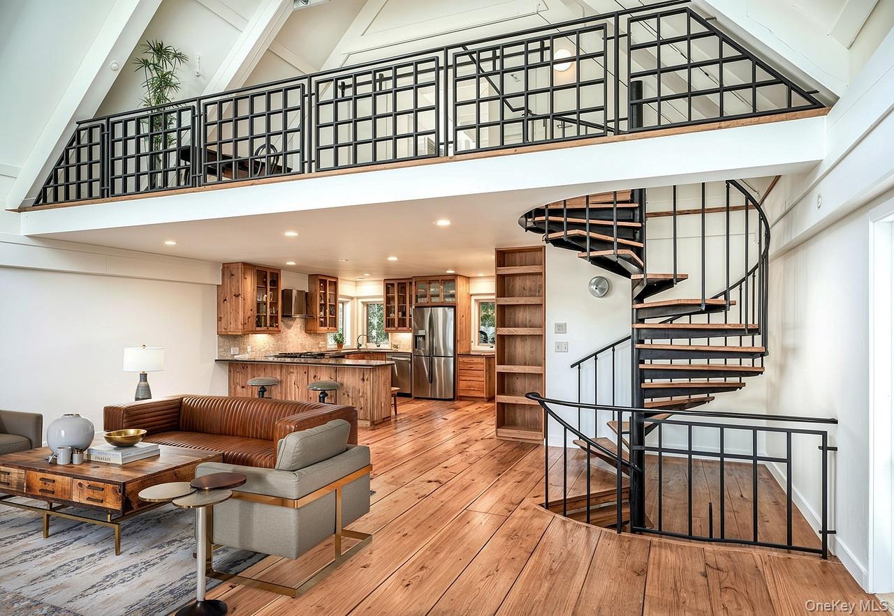 - Living area with a towering ceiling, stairs, light wood-style floors, and recessed lighting