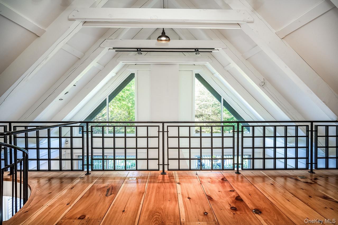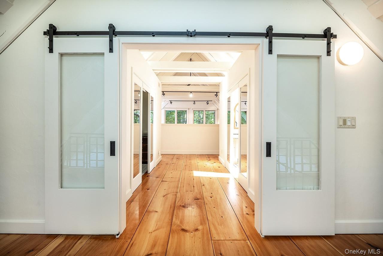 - Entryway with a barn door, wood-type flooring, and beamed ceiling