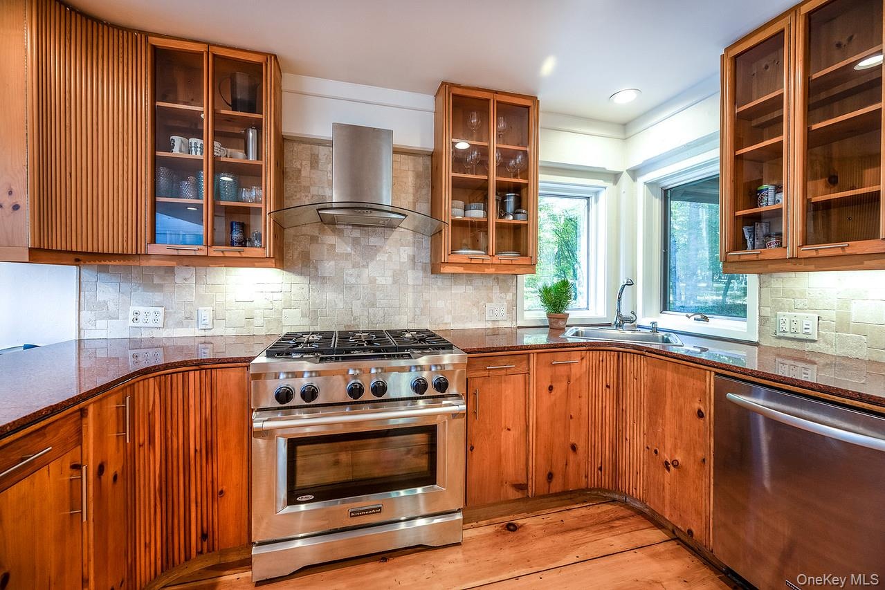 - Kitchen with a peninsula, glass insert cabinets, backsplash, appliances with stainless steel finishes, and recessed lighting
