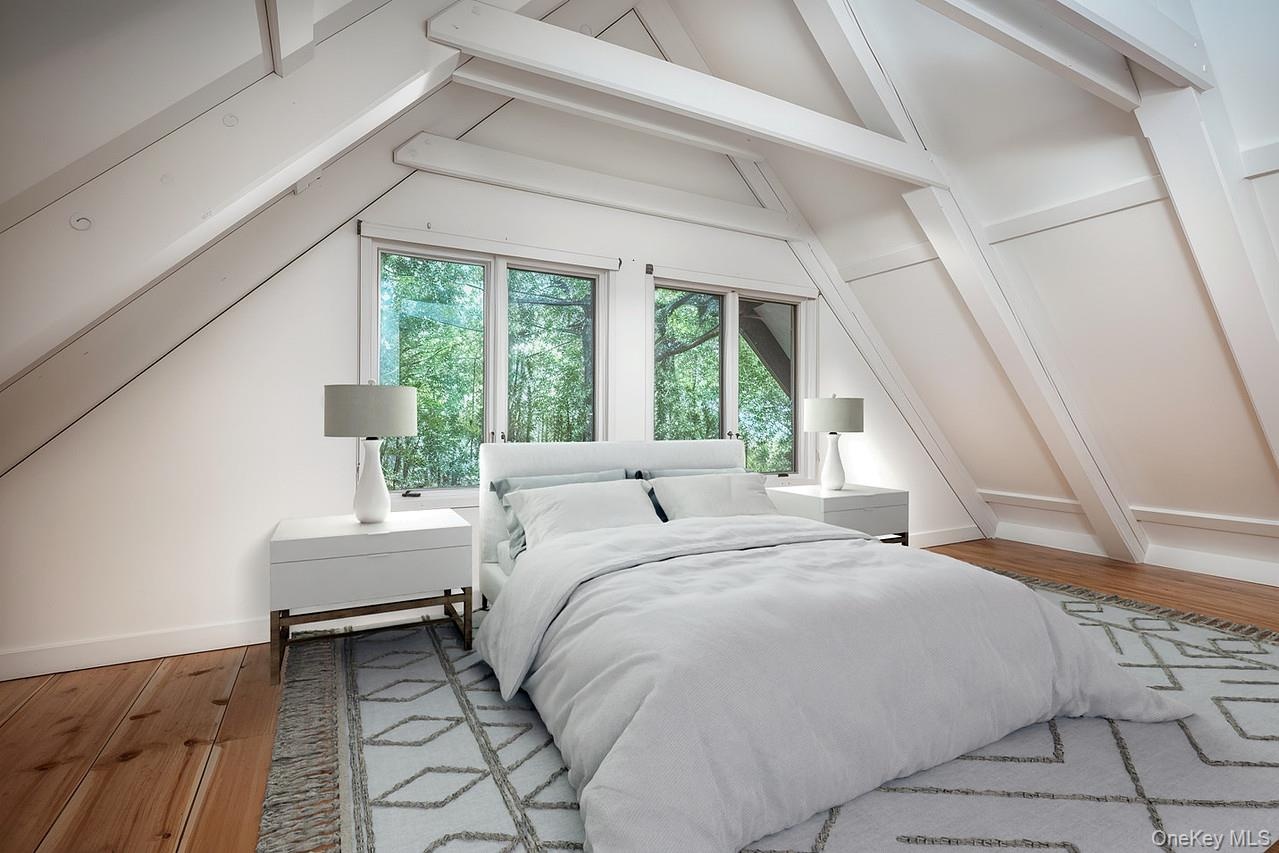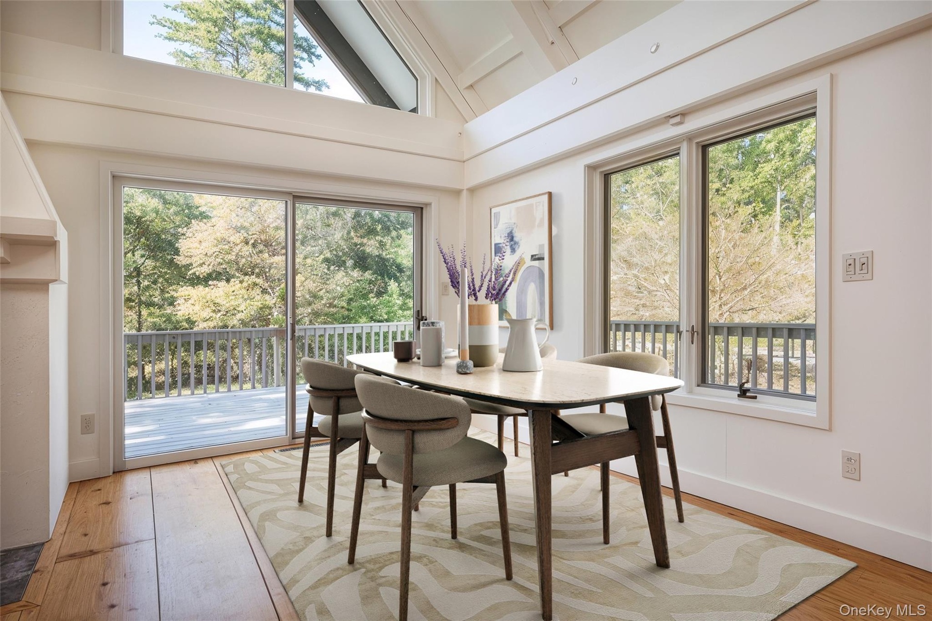- Dining space featuring wood-type flooring and high vaulted ceiling