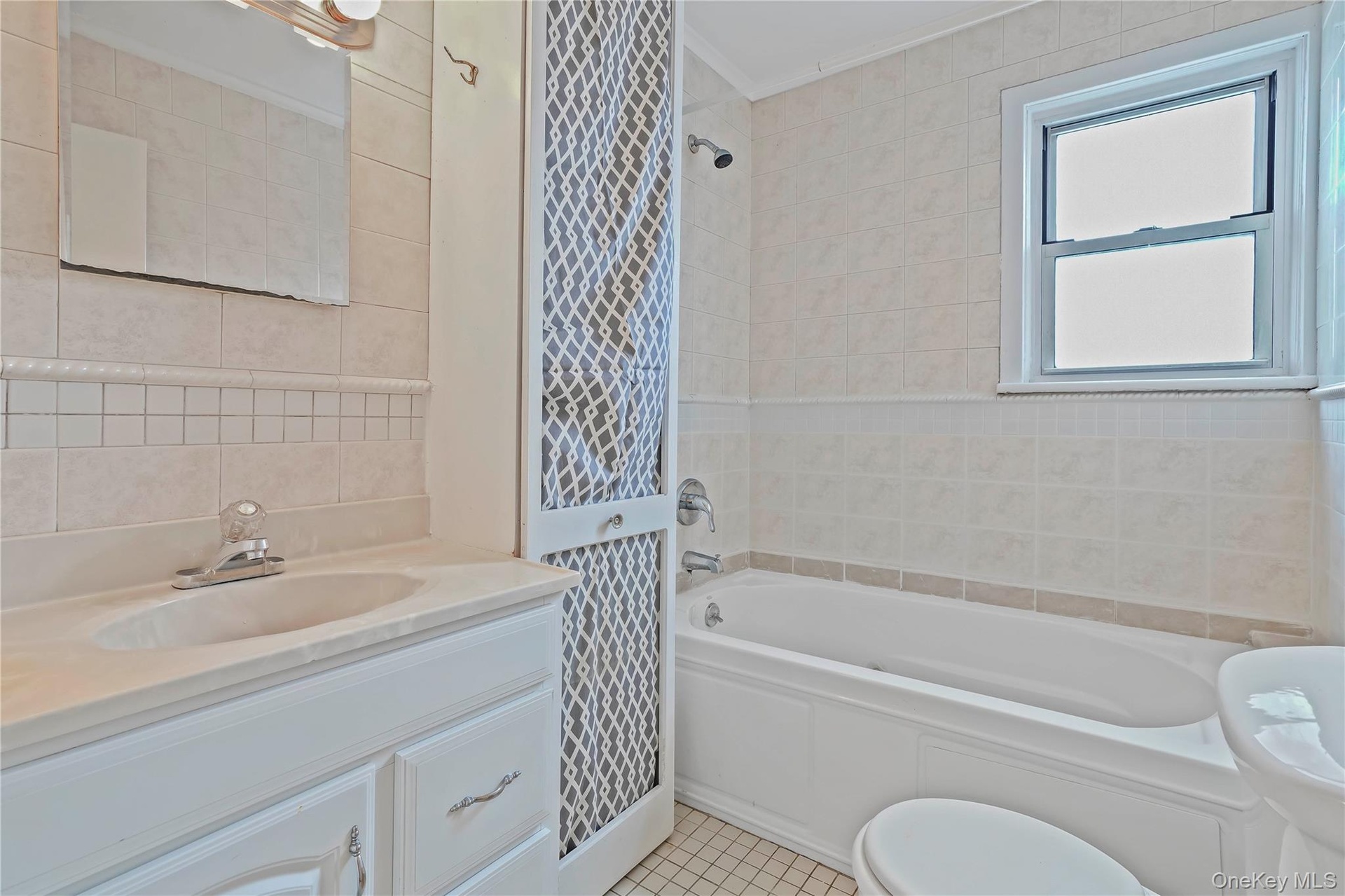 - Bathroom with tile walls, shower / washtub combination, and vanity