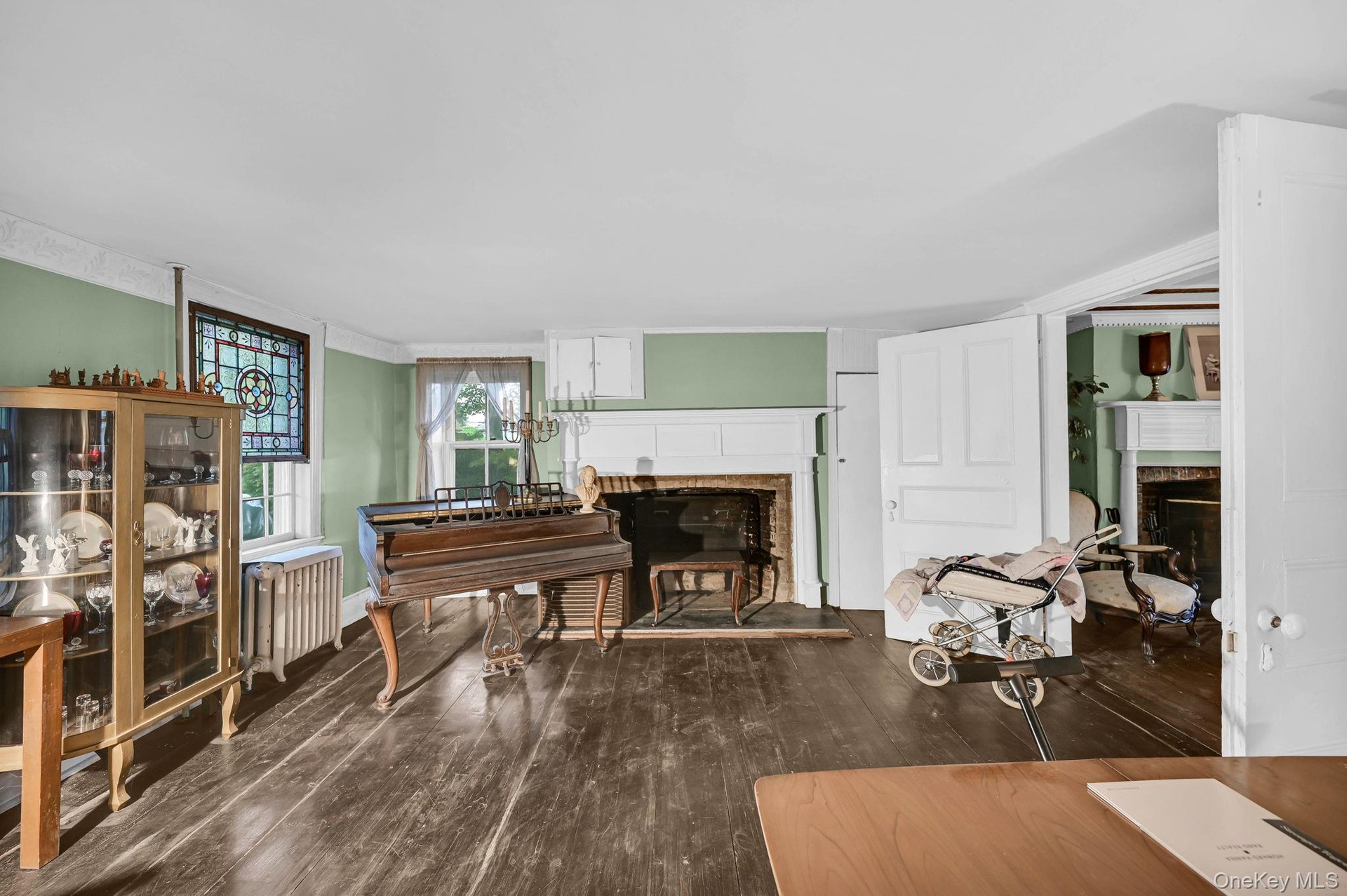 - Sitting room featuring a fireplace with raised hearth, dark wood-type flooring, and radiator