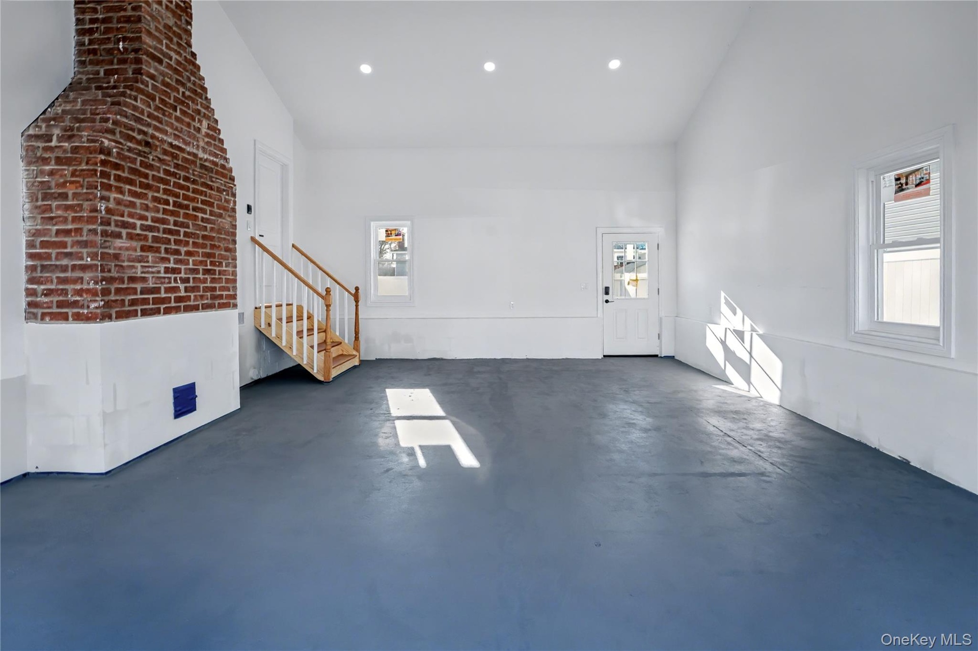 - Unfurnished living room with plenty of natural light, finished concrete flooring, high vaulted ceiling, recessed lighting, and stairs