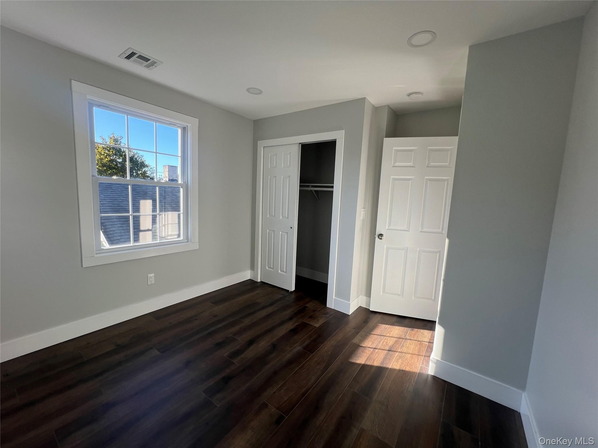 - Unfurnished bedroom with dark wood finished floors, a closet, and recessed lighting