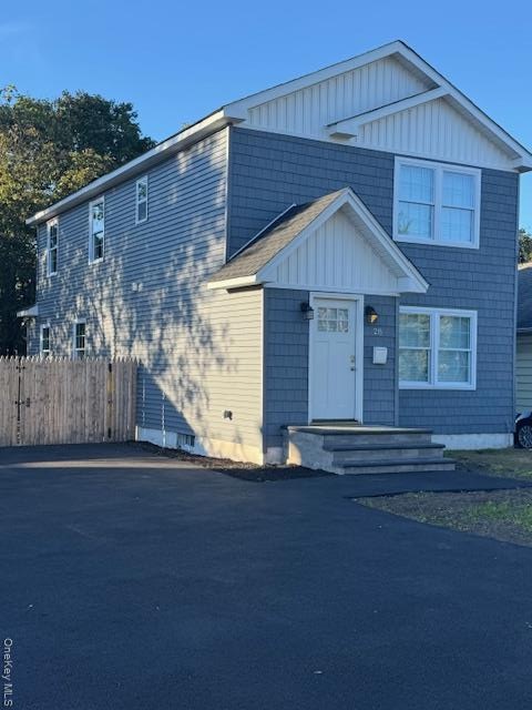 - View of front of house with board and batten siding