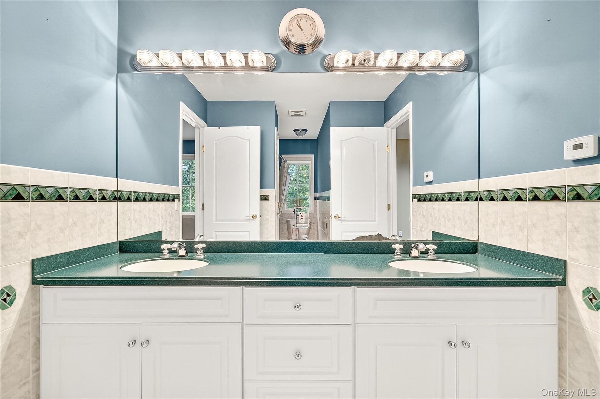 - Bathroom with plenty of natural light, a whirlpool tub, two vanities, high vaulted ceiling, and tile walls