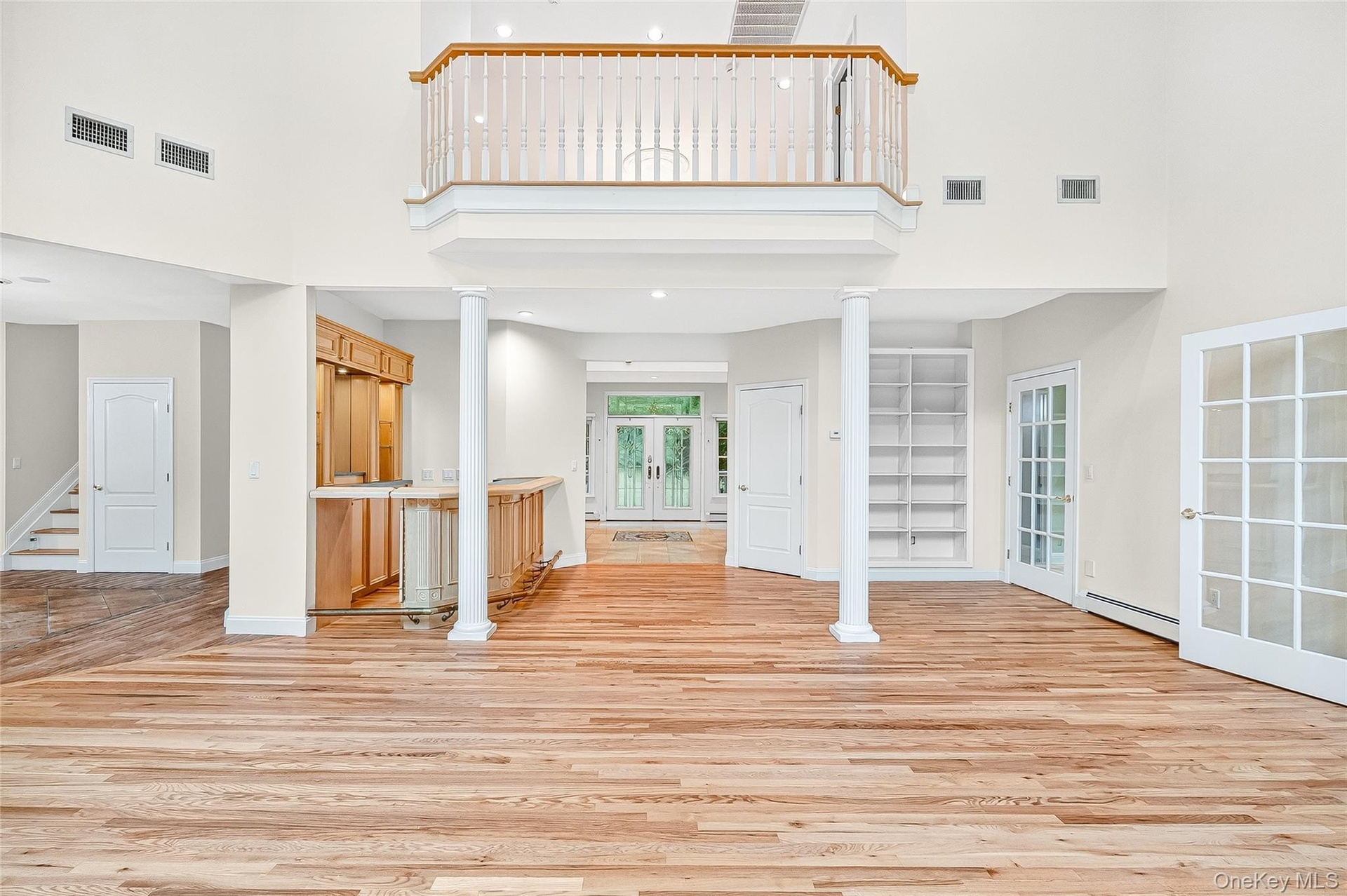 - wood finished floors, a towering ceiling, a baseboard heating unit, ornate columns, and french doors