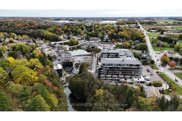 This Luxury suite was designed for those looking to downsize without compromise. 2,098 Sqft of thoughtfully designed living space, this stunning first-floor residence combines the ease of Condo Living with the space and comfort of a Detached Home. This open concept layout has incredible flexibility, allowing you to tailor the space to suit your needs. The expansive dining area comfortably accommodates a full sized dining table, perfect for hosting dinner parties or cherished family gatherings, with room to bring your heirloom set. The living room is ideal for entertaining or relaxing with multiple seating areas and direct access to a sprawling 247 sqft Terrace, perfect for outdoor dining or enjoying your morning coffee. The designer kitchen, complete with an oversized island, with seamless integration into the living and dining areas. Tucked away the primary suite is a true retreat, accessed by a separate hallway and features a spa-inspired ensuite bath and generous walk-in closets. A second spacious bedroom, ideal for family or guests with a large closet & the 3rd bonus room provides added versatility, easily used as a home office, media room or even a 3rd bedroom for visitors. The full-size laundry room offers additional storage and convenience. Located on the ground floor, this suite offers direct views of the Terrace and across the river to the Elora Mill. Perfect for pet owners or those who prefer to avoid elevators. Start your mornings with a short stroll to the resident lounge to enjoy coffee and fresh pastries from the Elora Mill. This suite includes one underground parking space, a locker, and offers access to resort-style amenities: Fitness centre, Yoga studio, Lounge and Lobby Coffee Bar, Outdoor Terrace, and a Pool with Spectacular River Views!! Experience refined living in one of Ontario's most charming and walkable communities. Just steps away from award winning restaurants, artisan shops, cafes and the natural beauty of Elora.