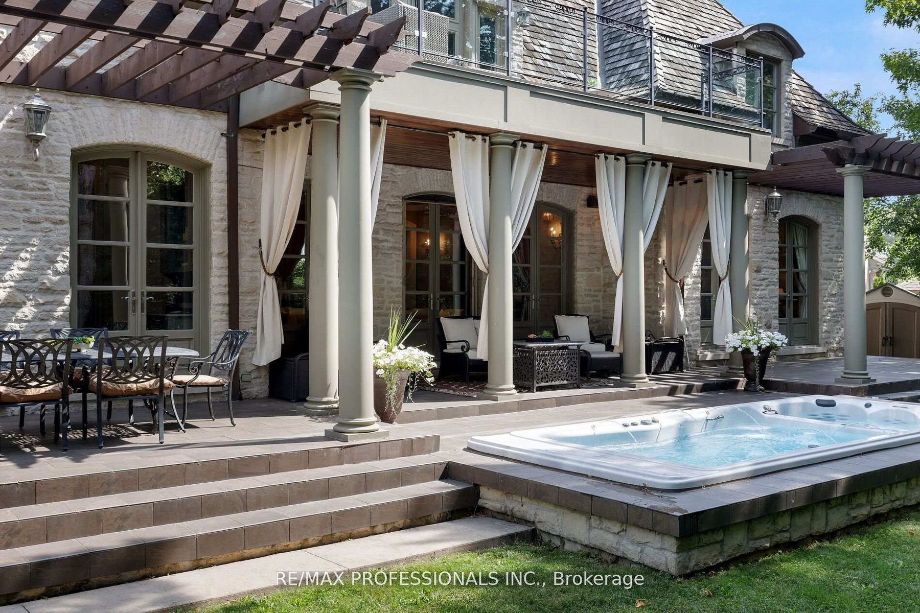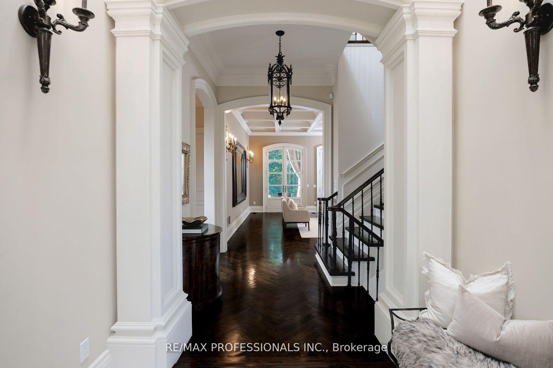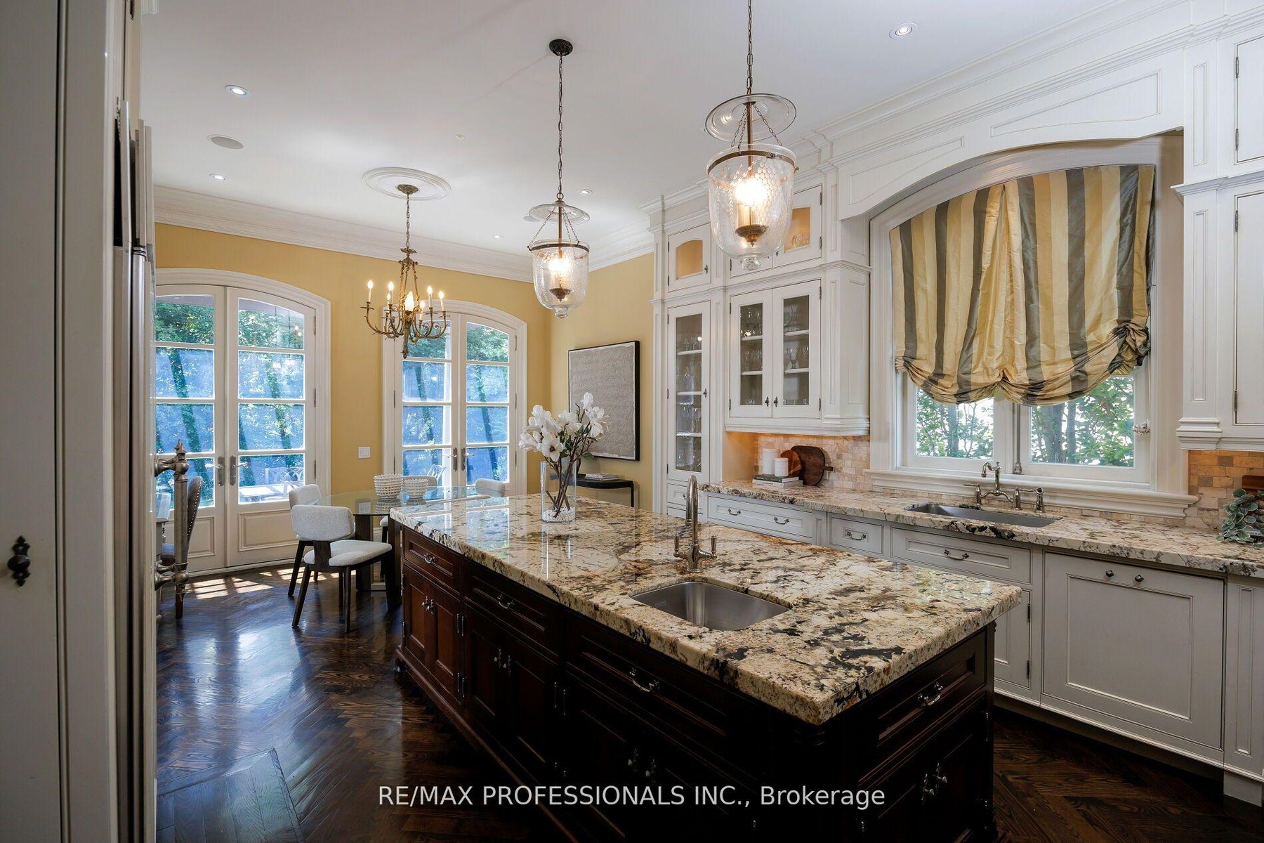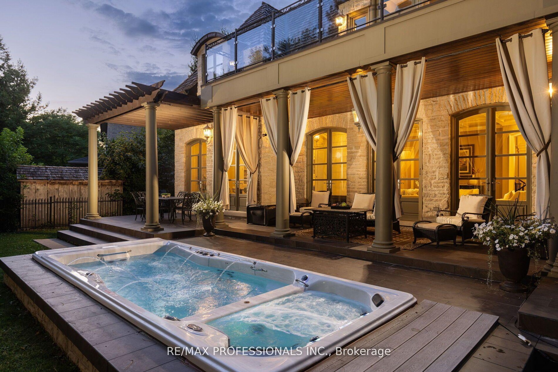 A truly no-expense-spared custom home on the Mimico Creek Ravine. Welcome to Fifty Six Ravenscrest Drive. With a commanding, solid stone exterior, atop a wide ravine lot, the curb appeal is undeniable. Enter an elegant interior - soaring double-height foyer, solid oak herringbone floors, and grand principal rooms. Stunning chef's gourmet kitchen. This home is designed with the future in mind, featuring two luxurious primary retreats, one on the main floor and one on the second level, along with well-appointed secondary bedrooms. The backyard is intimate & totally private, with ample ravine frontage, seven main-floor walkouts open to a gorgeous pillared terrace, and a Michael Phelps swim spa with a hot tub - perfect for low-maintenance, year-round use. Impressive French Country Chateau architecture. Priced well below replacement cost!
