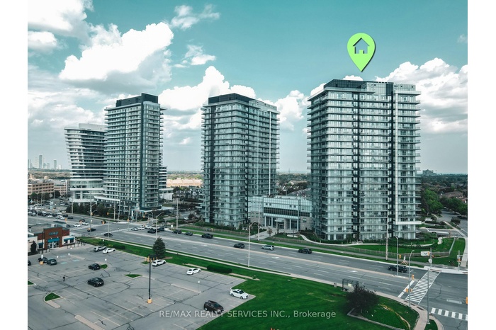 Welcome to this stunning 2 bedroom + den, 2-bathroom condo offering a bright, open-concept layout with nearly 9' smooth ceilings, wide-plank laminate flooring, and contemporary finishes throughout. The sleek kitchen features stone countertops and large stainless-steel appliances, flowing seamlessly into spacious living and dining areas that open onto a private L-shaped balcony with beautiful views of the CN Tower and Lake Ontario. Enjoy the convenience of ensuite laundry, one parking spot, and one locker. Rent includes heat, A/C, and water (tenant pays hydro). Exceptional building amenities include a rooftop outdoor pool, BBQ terrace, fitness club, lounge, and beautifully landscaped grounds. Perfectly located steps from Erin Mills Town Centre, Credit Valley Hospital, top-rated schools, public transit, and major highways.