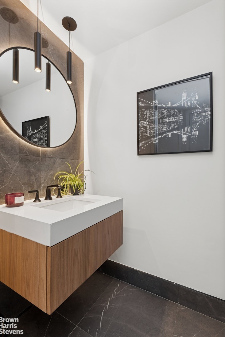 The primary suite includes a generous walk-in closet and a spa-like bathroom outfitted with a rain shower, large-format Calacatta tile, herringbone-patterned natural stone floors, and matte black Kohler fixtures. The second and third bedrooms are equally well-proportioned and are conveniently located near a thoughtfully designed full bathroom, along with a separate powder room for guests.
