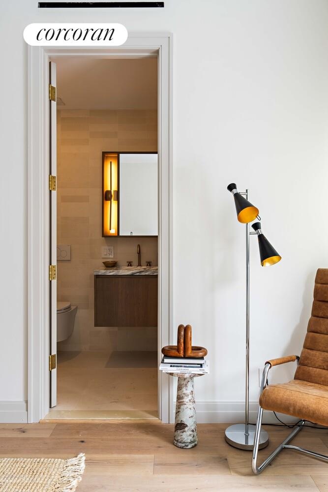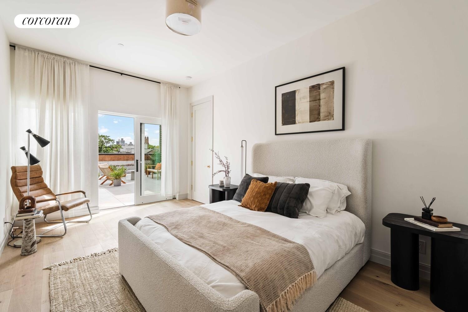 Ascending to the upper level, the primary suite unfolds as a private sanctuary of exceptional scale and light. The king-size bedroom is accompanied by an expansive walk-in closet and a sumptuous en suite bath, where Arabescato Fiorito Viola marble, dual sinks, and a spa-quality shower create an atmosphere of pure indulgence. Abundant morning light streams in through large sliding glass doors, that open onto a remarkable private roof terrace of more than 700 square feet - a secluded sanctuary for morning reflections, tranquil afternoons, and serene evenings above the city all with jaw dropping views of downtown Manhattan and Brooklyn skylines. A secondary entrance ensures the terrace is easily accessible for guests and entertaining, without the need to pass through the bedroom, making the space as versatile as it is breathtaking.