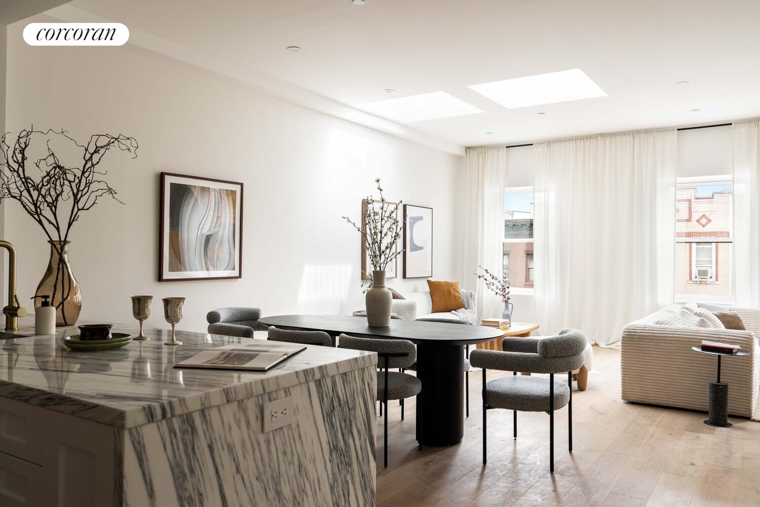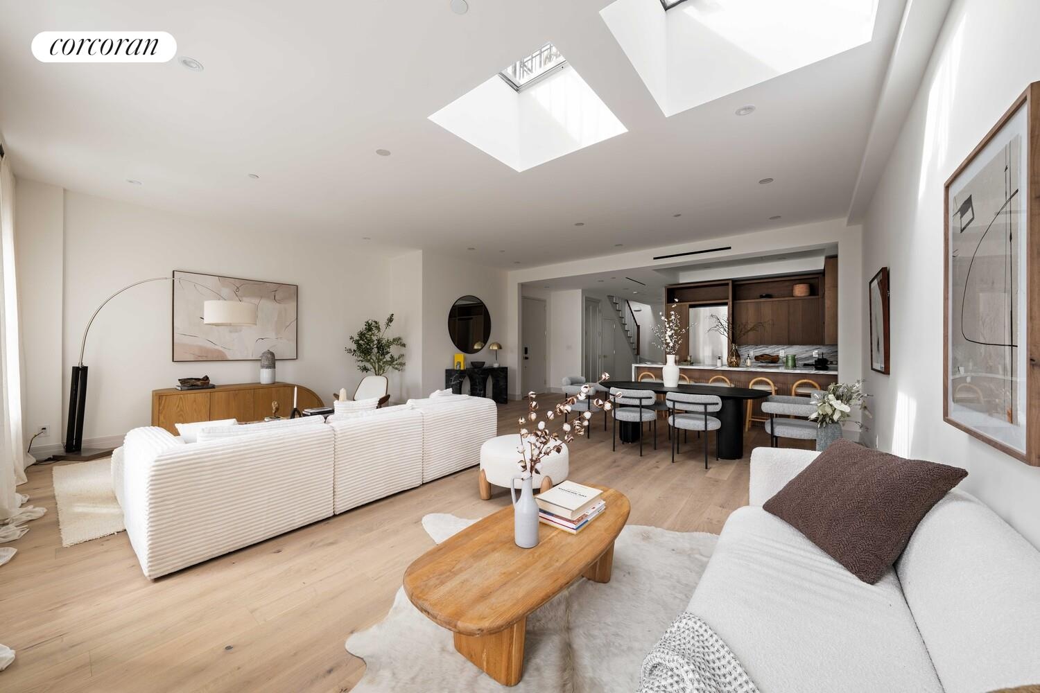 An graceful entry leads to the massive, 25-foot wide, loft-like living and dining area - where soaring ceilings, oversized windows, dual-skylights, and 6-inch white oak floors create a luminous and welcoming atmosphere awash with natural light.