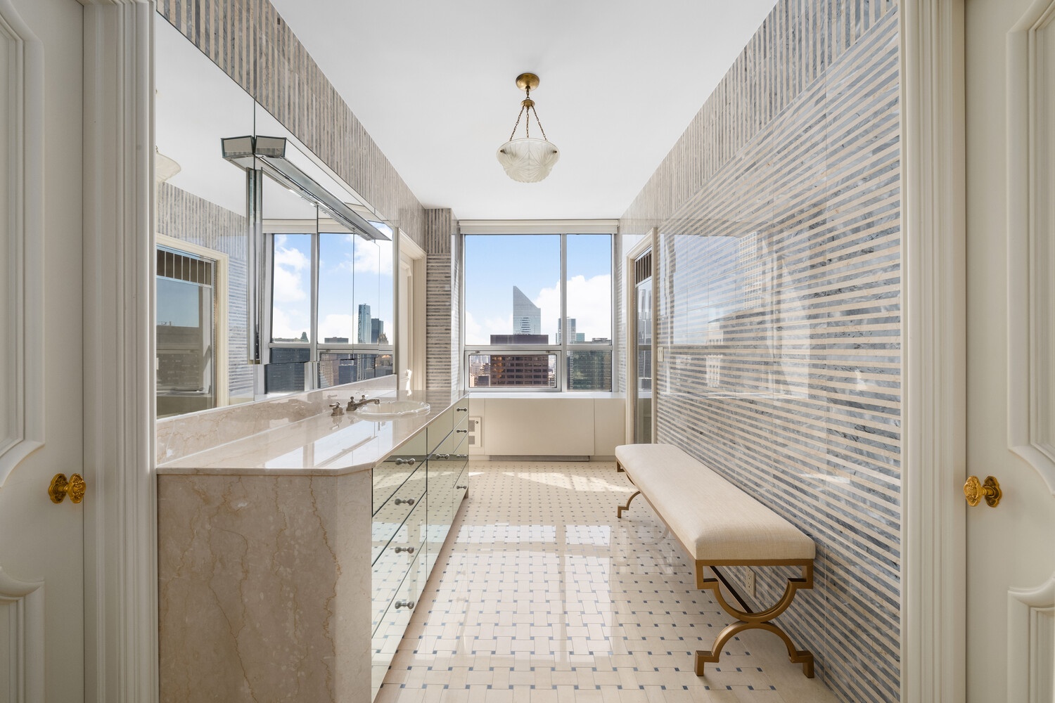 Spanning the full north and south exposures, this palatial duplex is a masterpiece of proportion, volume, and light. A dramatic double-height foyer with an imposing circular staircase introduces the residence, leading to an enfilade of grand entertaining rooms measuring nearly 100 feet in length. Floor-to-ceiling windows frame mesmerizing views of the Manhattan skyline, Central Park, and beyond, while multiple setback terraces-totaling over 2,000 square feet-invite outdoor dining and entertaining above the city.