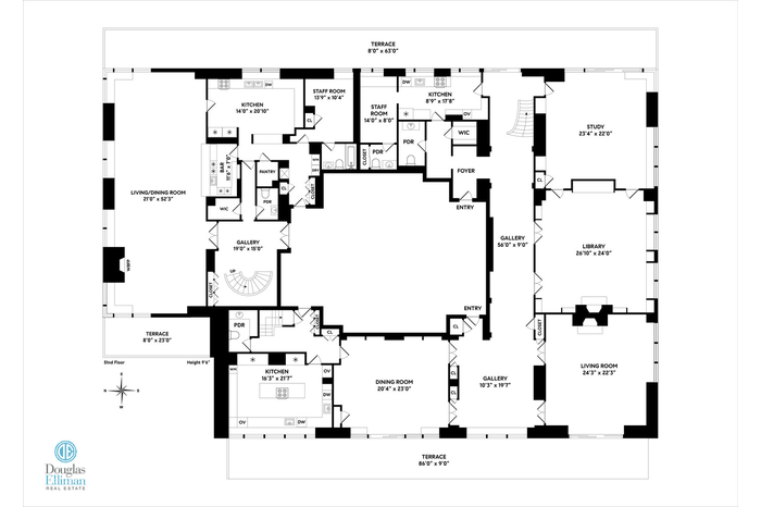 Spanning the full north and south exposures, this palatial duplex is a masterpiece of proportion, volume, and light. A dramatic double-height foyer with an imposing circular staircase introduces the residence, leading to an enfilade of grand entertaining rooms measuring nearly 100 feet in length. Floor-to-ceiling windows frame mesmerizing views of the Manhattan skyline, Central Park, and beyond, while multiple setback terraces-totaling over 2,000 square feet-invite outdoor dining and entertaining above the city.